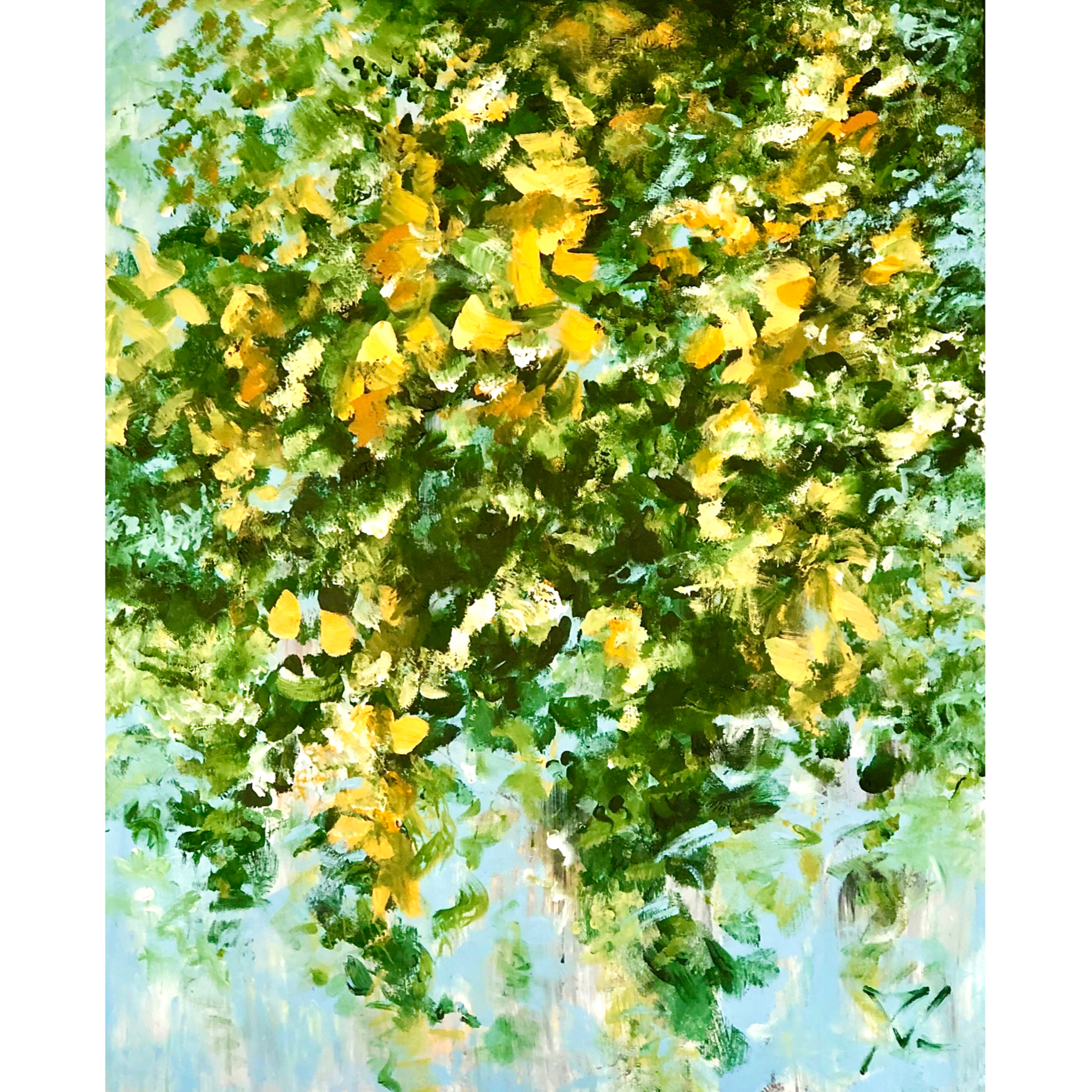 Dit kleurrijke schilderij is geïnspireerd op de sierlijke trossen van de goudenregen. De heldergele bloemblaadjes lijken neer te dwarrelen tegen een achtergrond van bladgroen en zacht groen blauw. Het werk straalt licht, beweging en lentevreugde uit. De losse penseelstreken geven het geheel een natuurlijke, bijna dansende uitstraling — alsof je onder een bloeiende boom staat. Over het werk: gesigneerd · acryl op canvas · opgespannen op stevig frame · meegeschilderde zijkanten · klaar om op te hangen Bij vragen neem gerust contact met mij op →