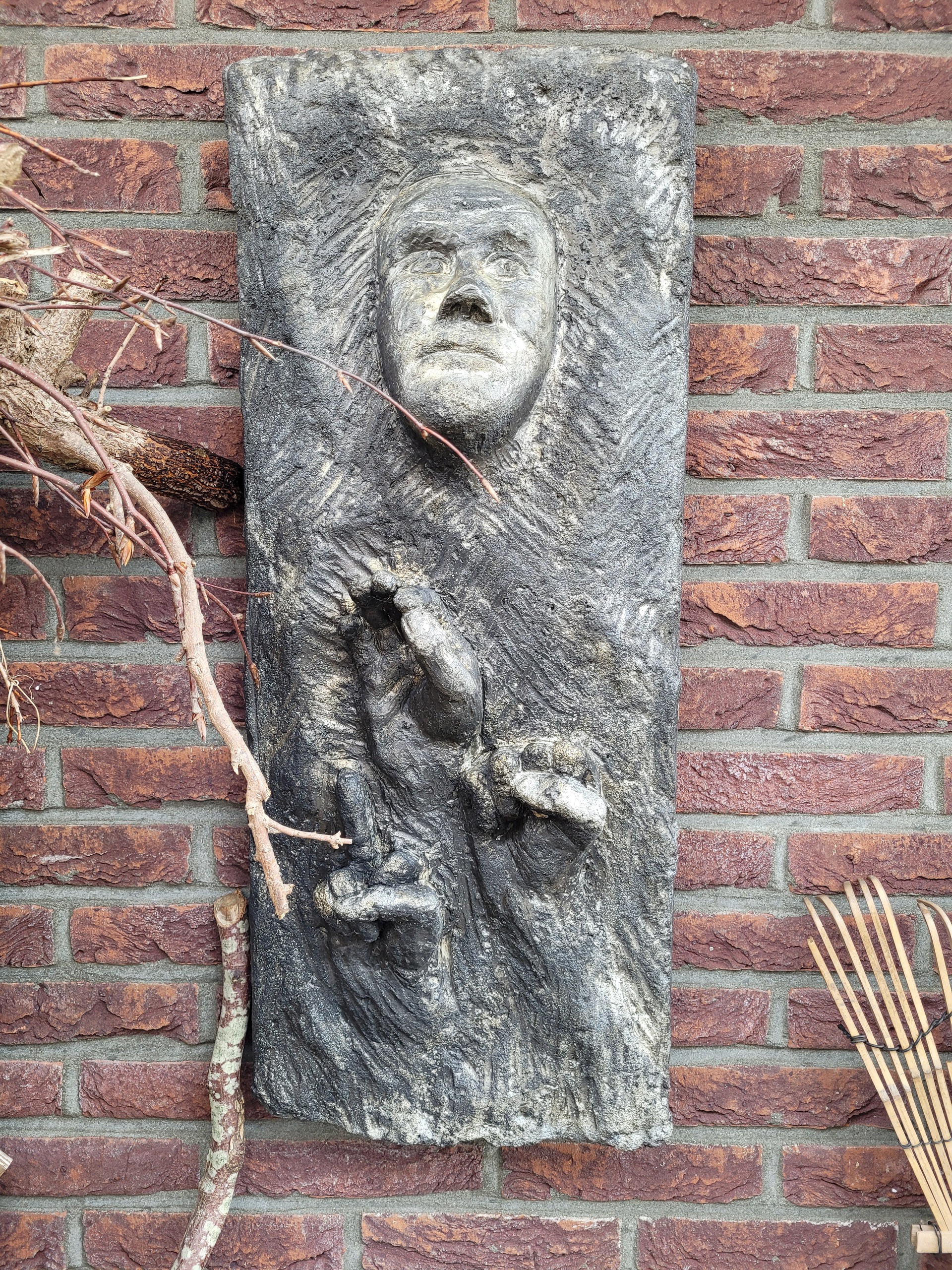 gevelsteen met handen die een aantal fases in een rouwverwerking symboliseren