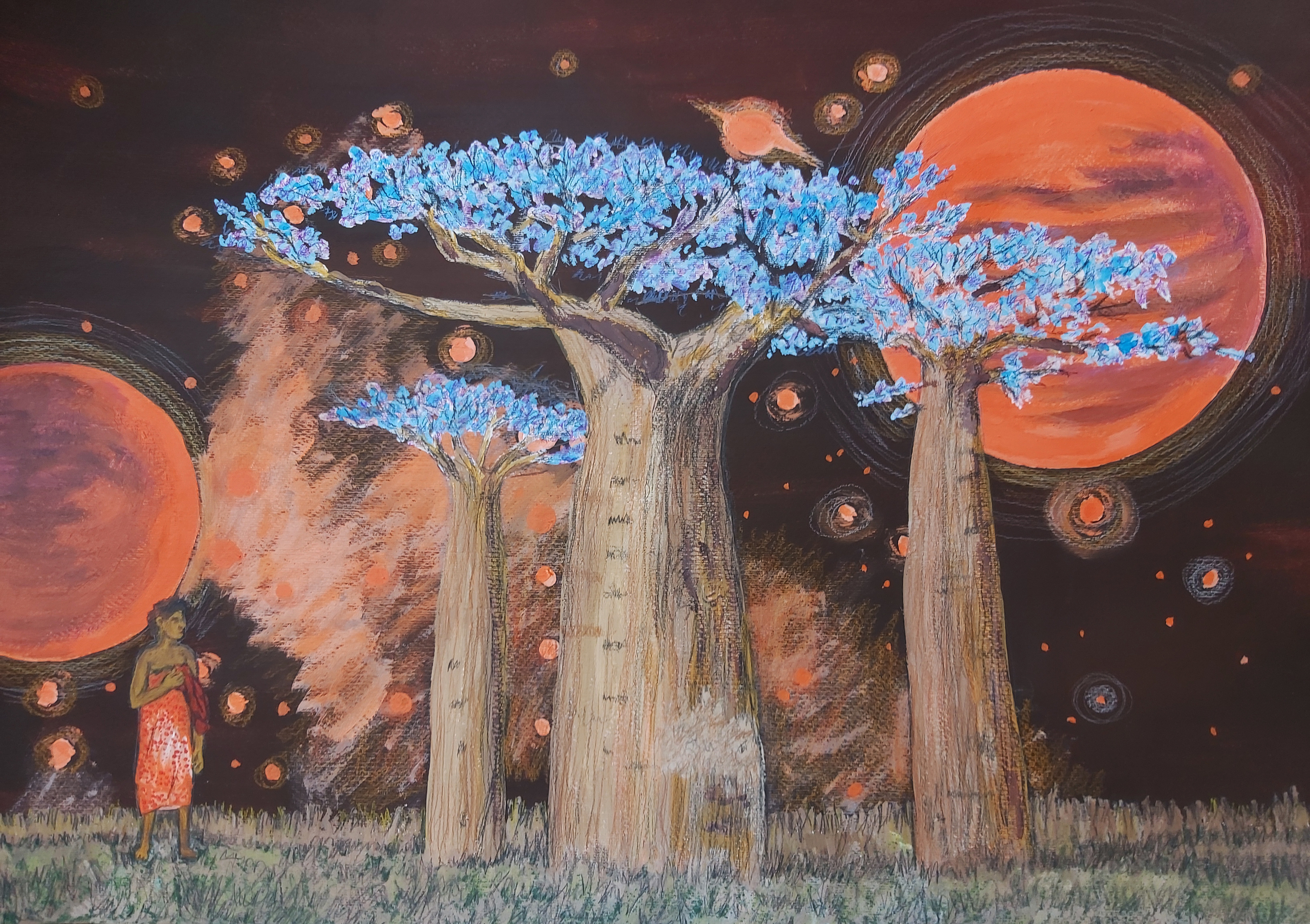 Jaren geleden heb ik Baobabs gezien op Madagascar. Ik vond ze erg mooi.Op dit werkstuk heb ik de planeten geplaatst in de achtergrond.