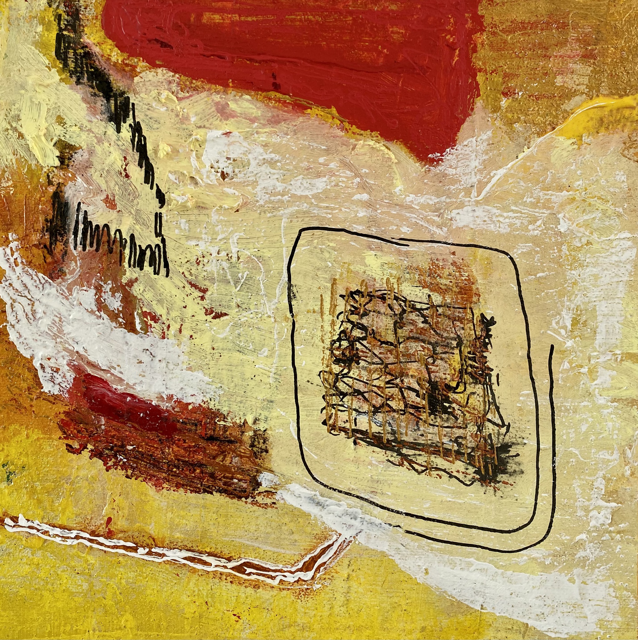Kleine kleurrijke abstracte schilderijtjes op doek. Ingelijst achter glas.