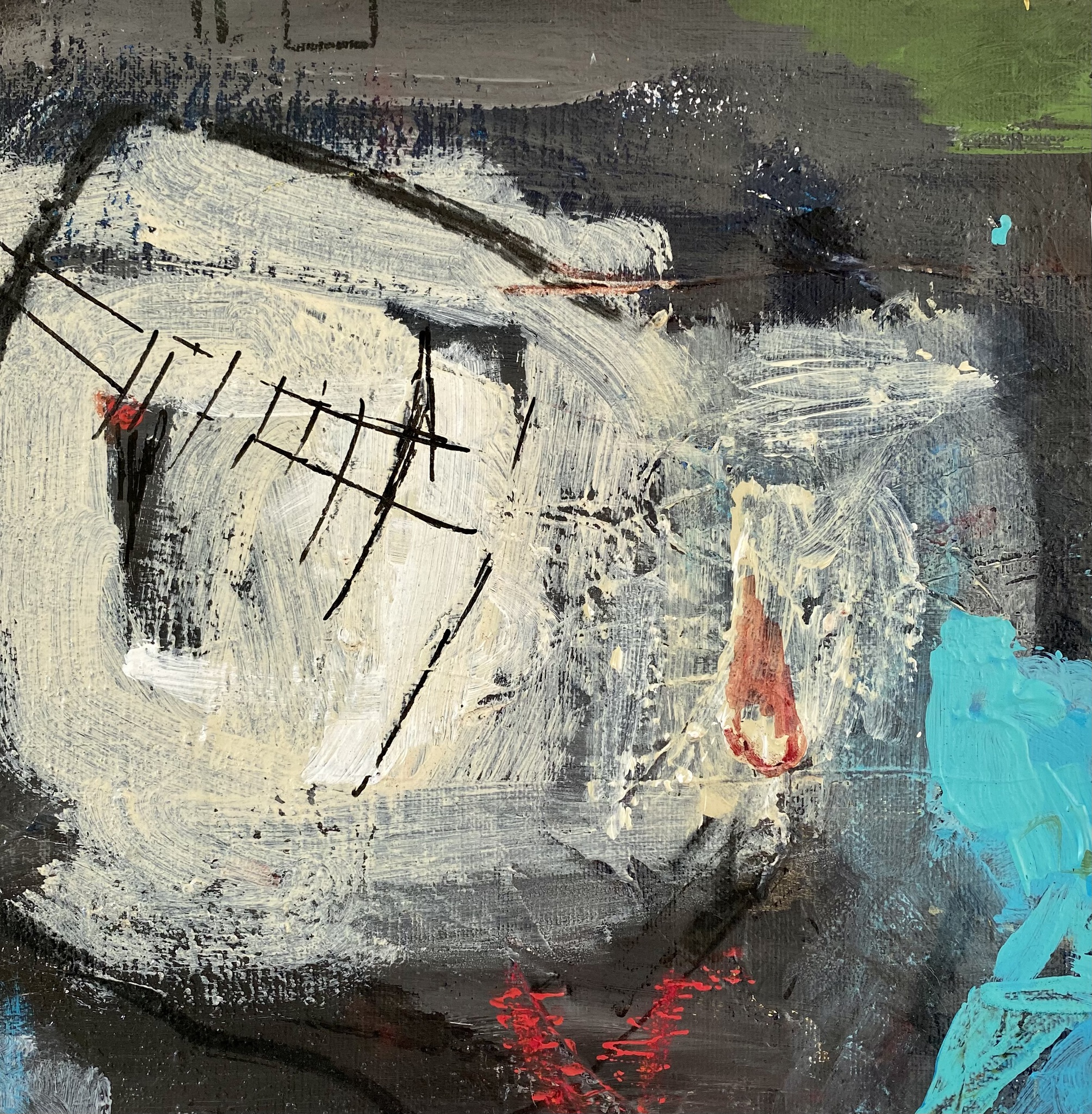 Kleine kleurrijke abstracte schilderijtjes op doek. Ingelijst achter glas.