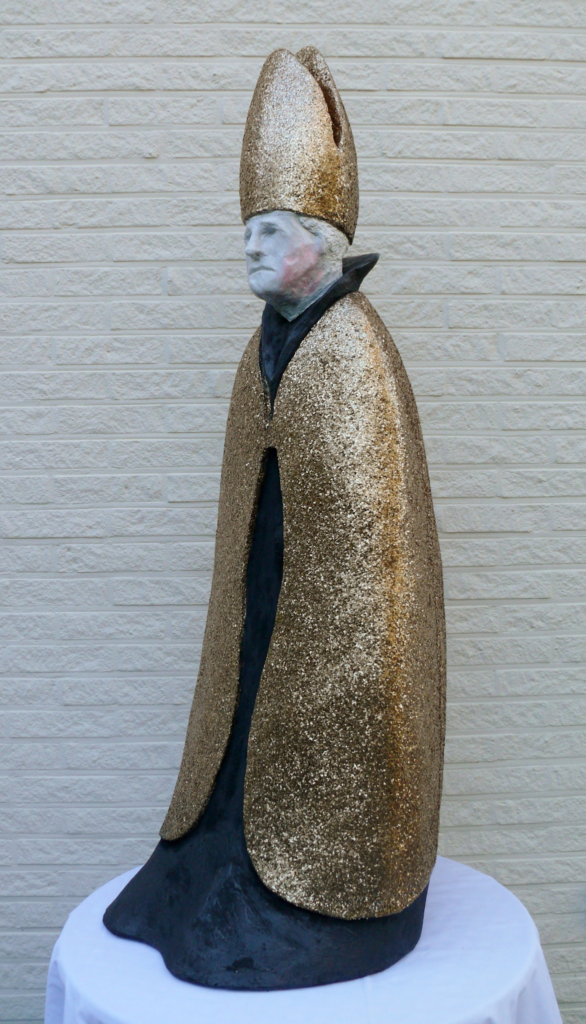 Misbruik van kinderen door clerus. Pracht en praal, de duivel in de mens (bokkepoot), het niet willen zien (ogen dicht) het boetekleed (zwart) en de schaamte (wit gezicht met rode blos) Materialen: polyester, micca, magnesium, glasvezel
