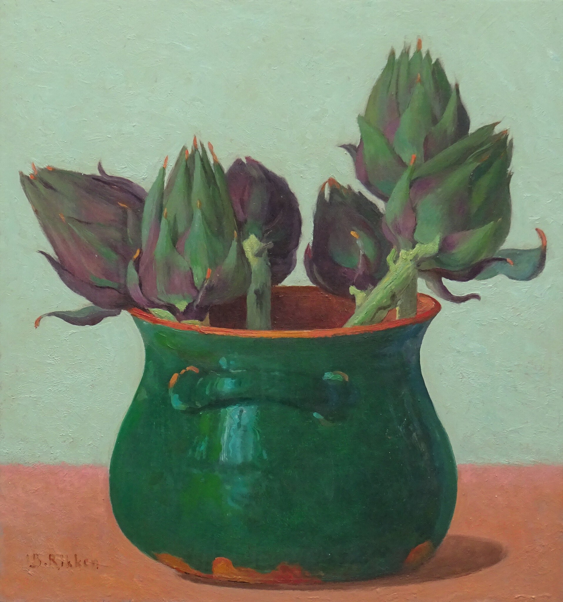 Dit stilleven is er een uit een serie over etenswaren, zoals : vlees, vis, groente, fruit .Wat me er in aantrekt is de schoonheid van het dagelijkse ..De stofuitdrukking is natuurlijk een uitdaging voor een schilder als ik. Het paars-violet en het groen in de artisjokken combineert mooi met het groen van de pot en de roze ondergrond. Kijk ook eens op : https://www.benrikken.nl/stillevens