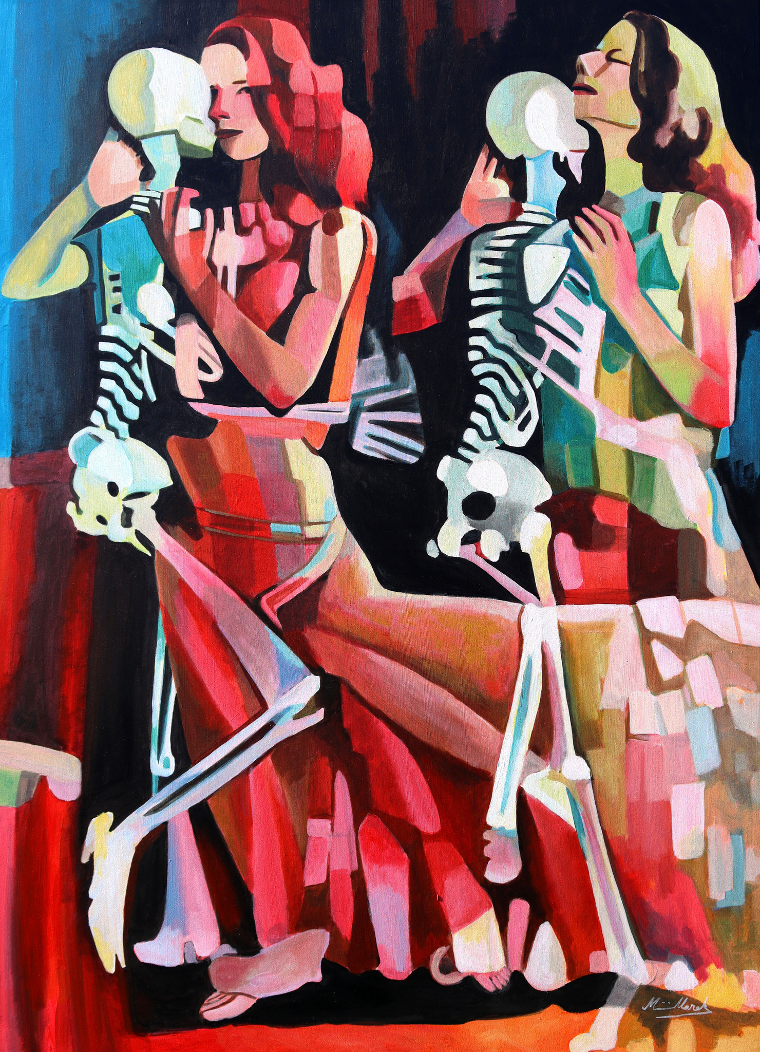 In dit werk heb ik een jonge vrouw afgebeeld die danst met een skelet. Dit werk speelt in op het "vanitas" thema. Een thema dat eeuwenlang in de schilderkunst terug kwam. Door het tafereel in tweevoud te schilderen, heb ik getracht de beweging van de dans in het werk te stoppen. Niets is voor eeuwig, geniet van het moment!