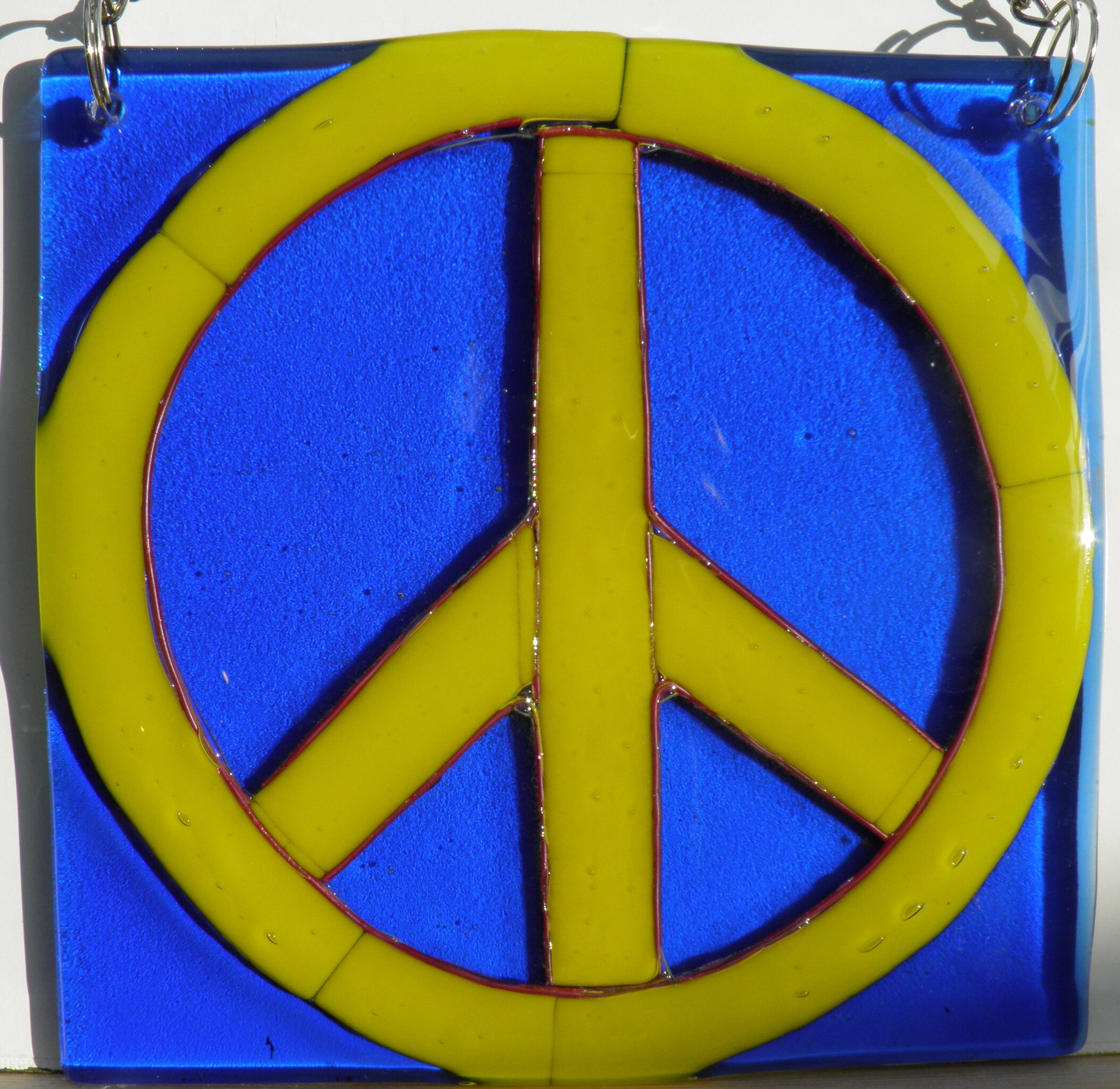 Eénmalig uniek peoject. Ban de bom teken in transparant en opaal glas in de kleuren van de Oekraïne. Koperdraad is in het glas verwerkt waardoor het rood is gekleurd. Symbolisch voor de kogels en het bloed dat is gevloeid. Ook te gebruiken als raamhanger.