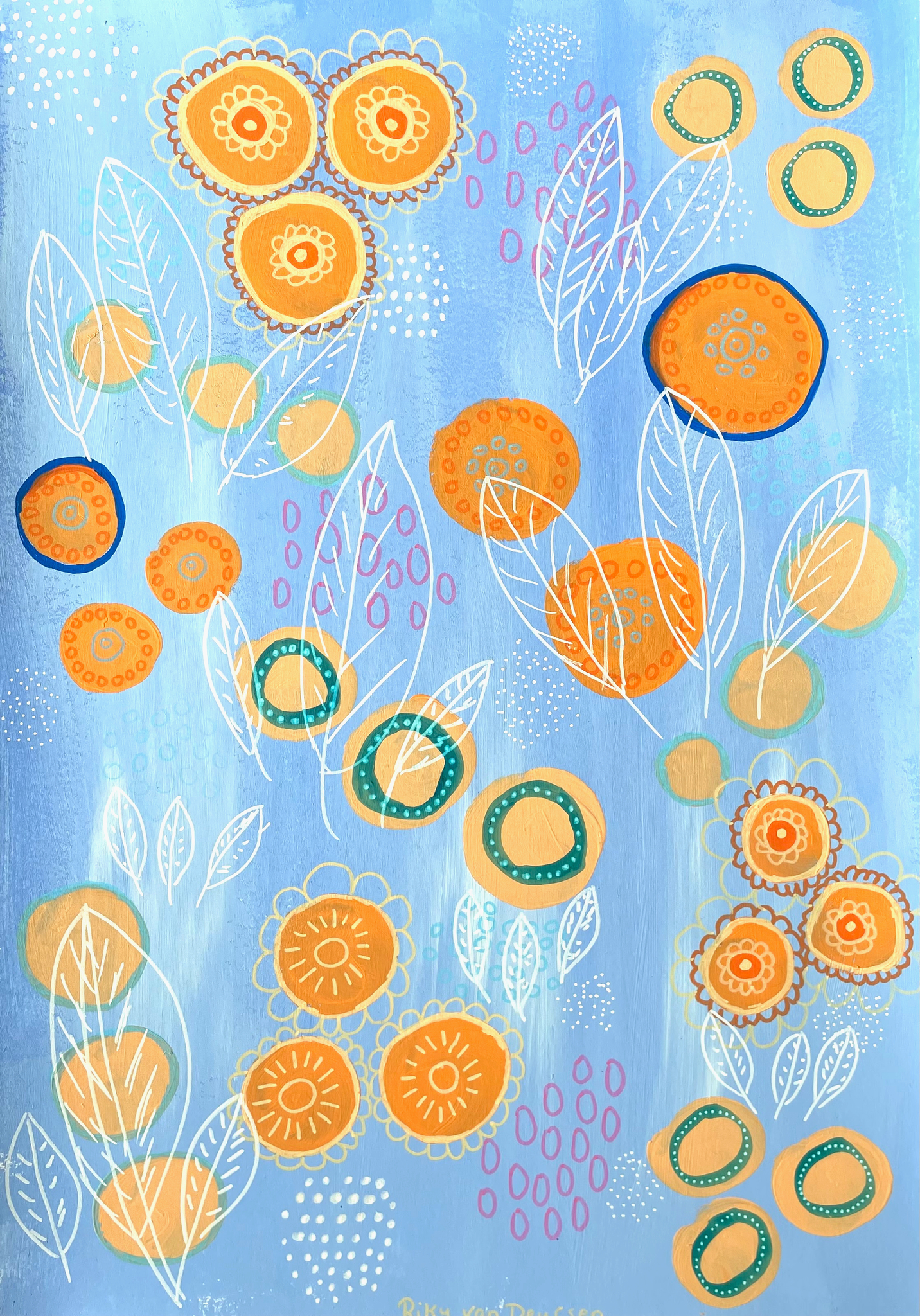 Vrolijk abstract bloemen schilderij op mix media papier (A3) in lichtblauw en oranje. Er is gewerkt met acrylverf en acrylmarkers.