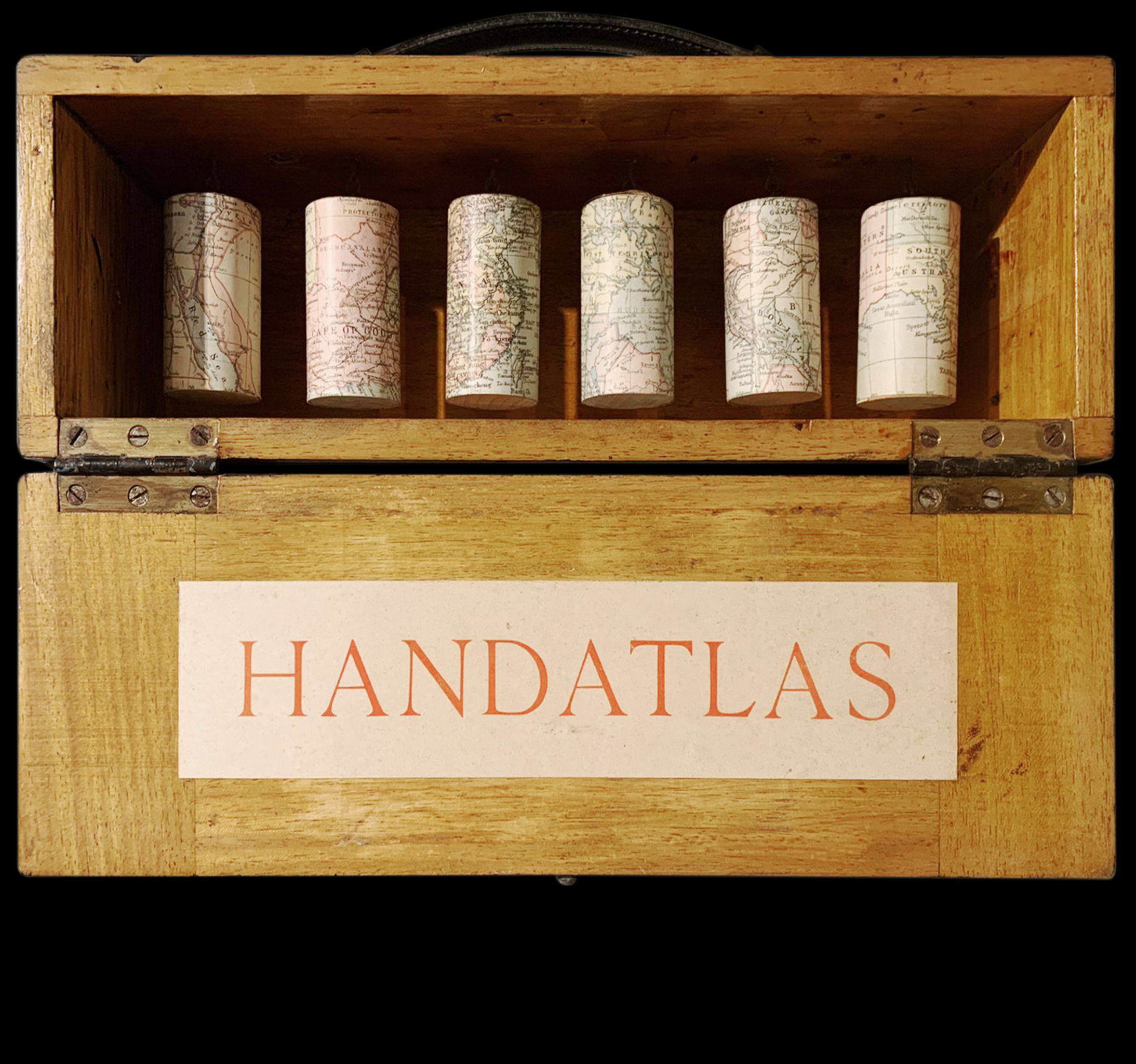 Reiskistje met antieke wereldkaartfragmenten uit Andrees Handatlas 1922