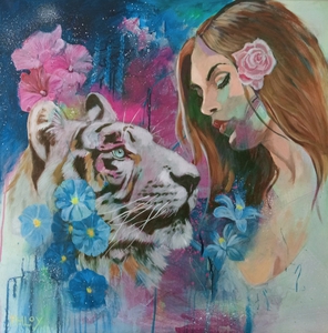 Petra Verlooij Schilderes van abstract werk in experimentele technieken en abstract werk met een dier.