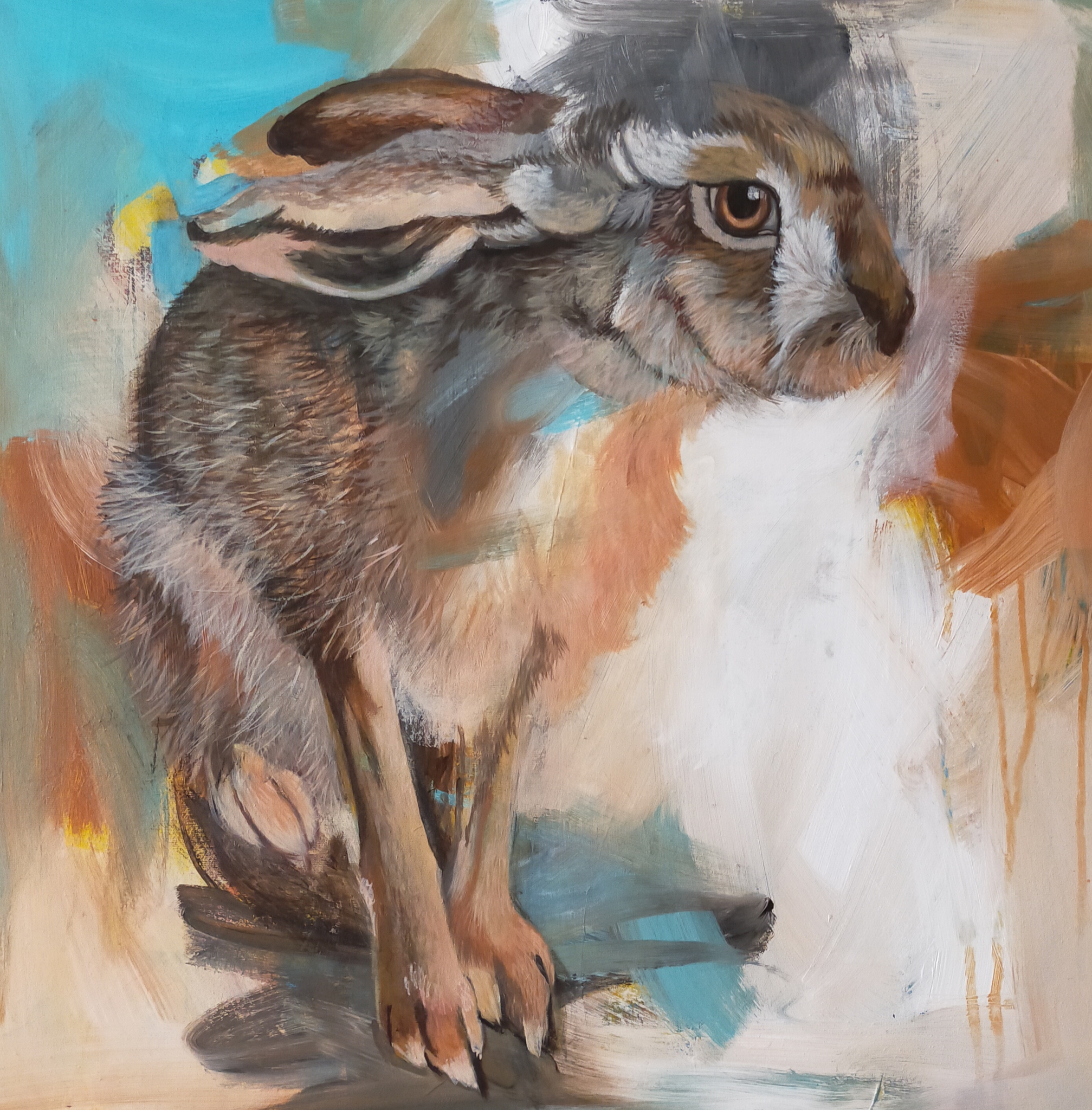 Bij ons in de polder tussen Etten-Leur en Zevenbergen zijn heel veel hazen te zien. In april zijn de mannetjes veel aan het 'boxen. Deze haas is geschilderd in een abstracte experimentele achtergrond.