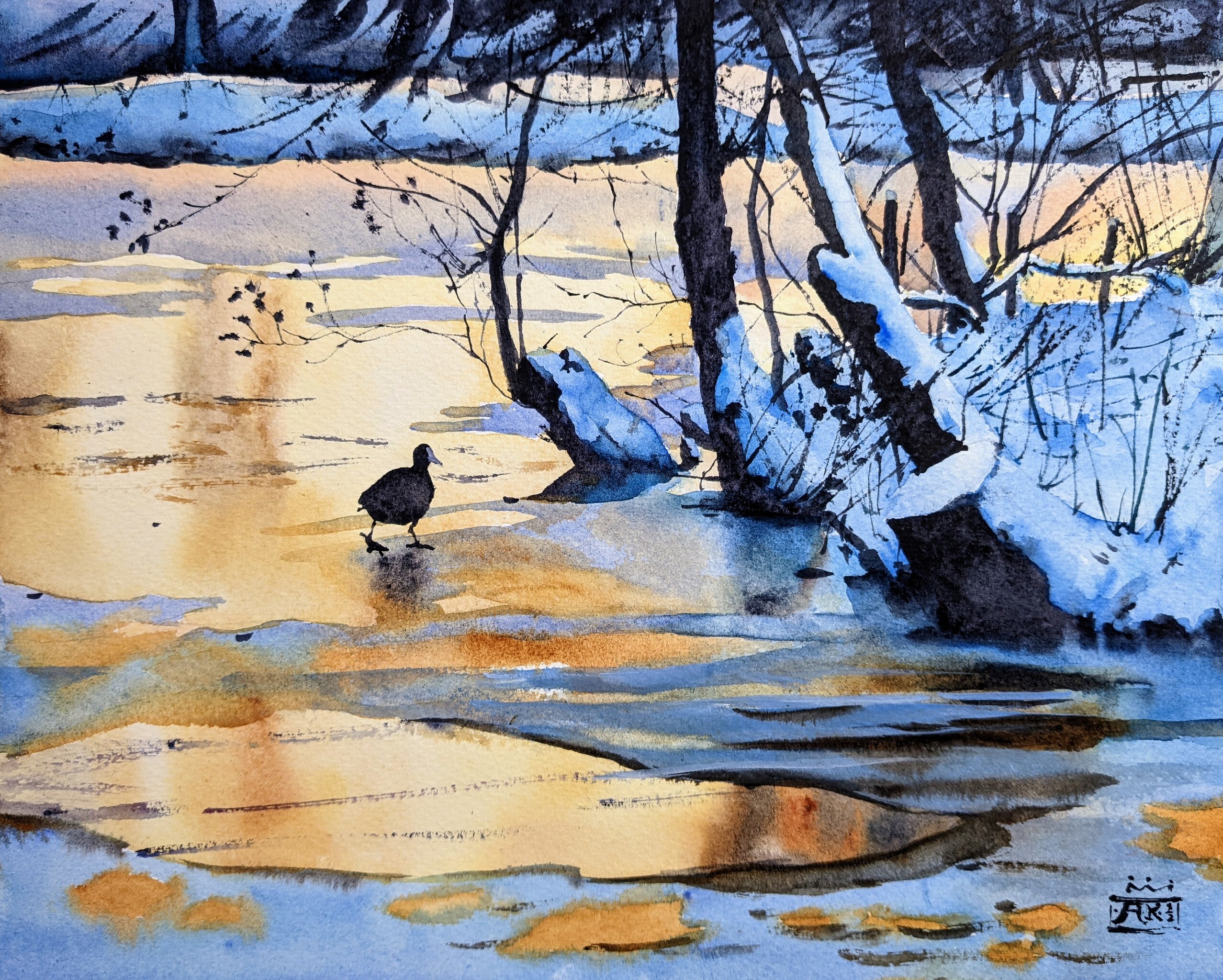Landschap Vogel Wildlife Aquarel Realistisch Sneeuw Bomen Winter Bird Watercolor Ijs Meerkoet Coot