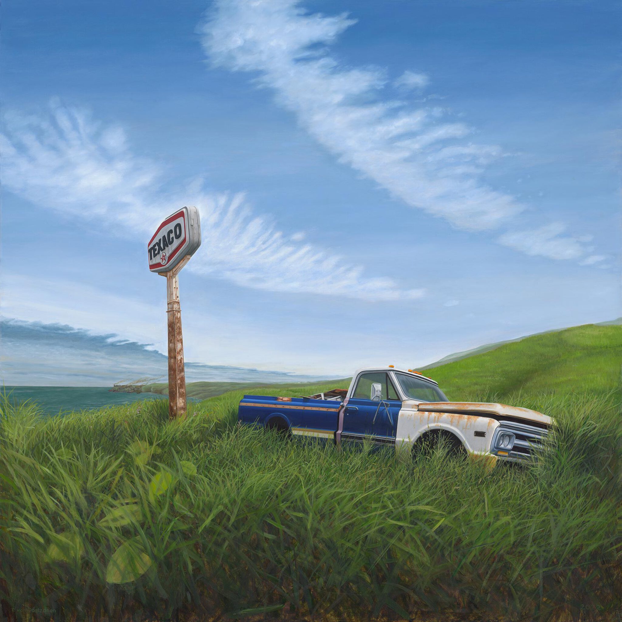 Schilderij Blauw Wolken Groen Magisch Realistisch Lucht Gras Auto Station Wrak Benzine Oostzanen