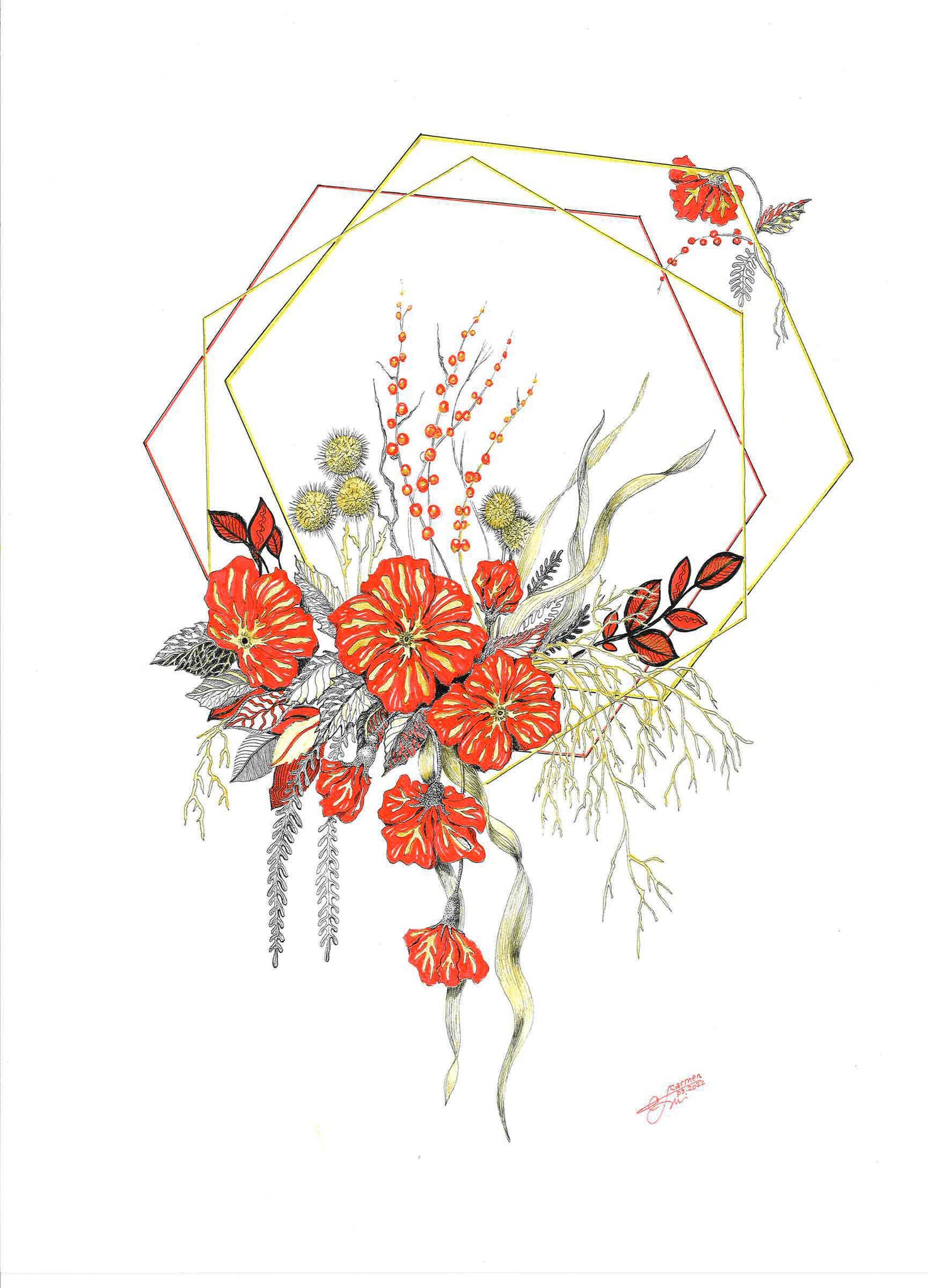 #pentekening #abstracte #bloemen #rood/zwart/goud #ikebana #carmentodita
