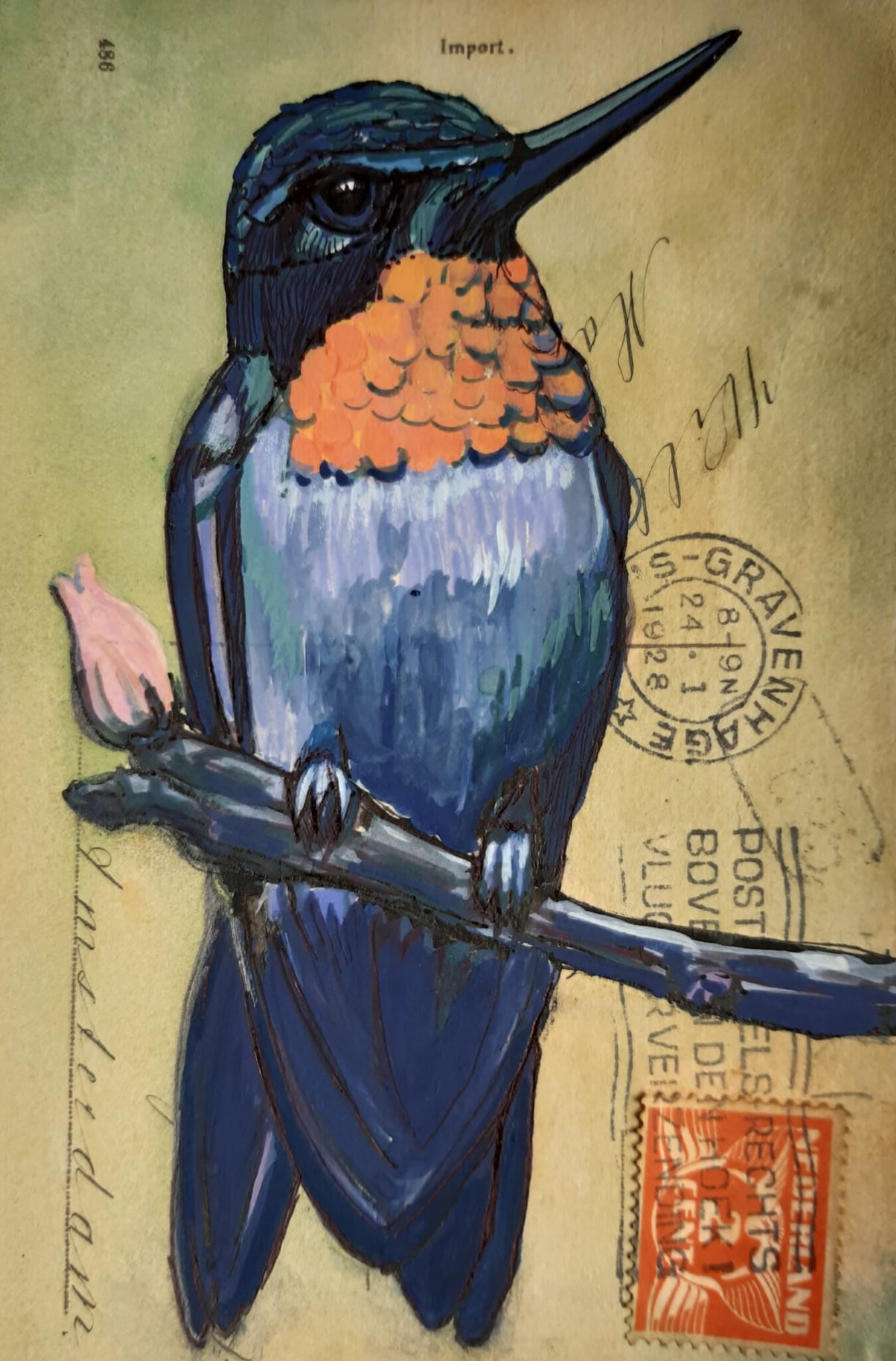 Oranje Klein Gouache Kolibri Donkerblauw Gemengde_techniek Roze_detail Klein_werk