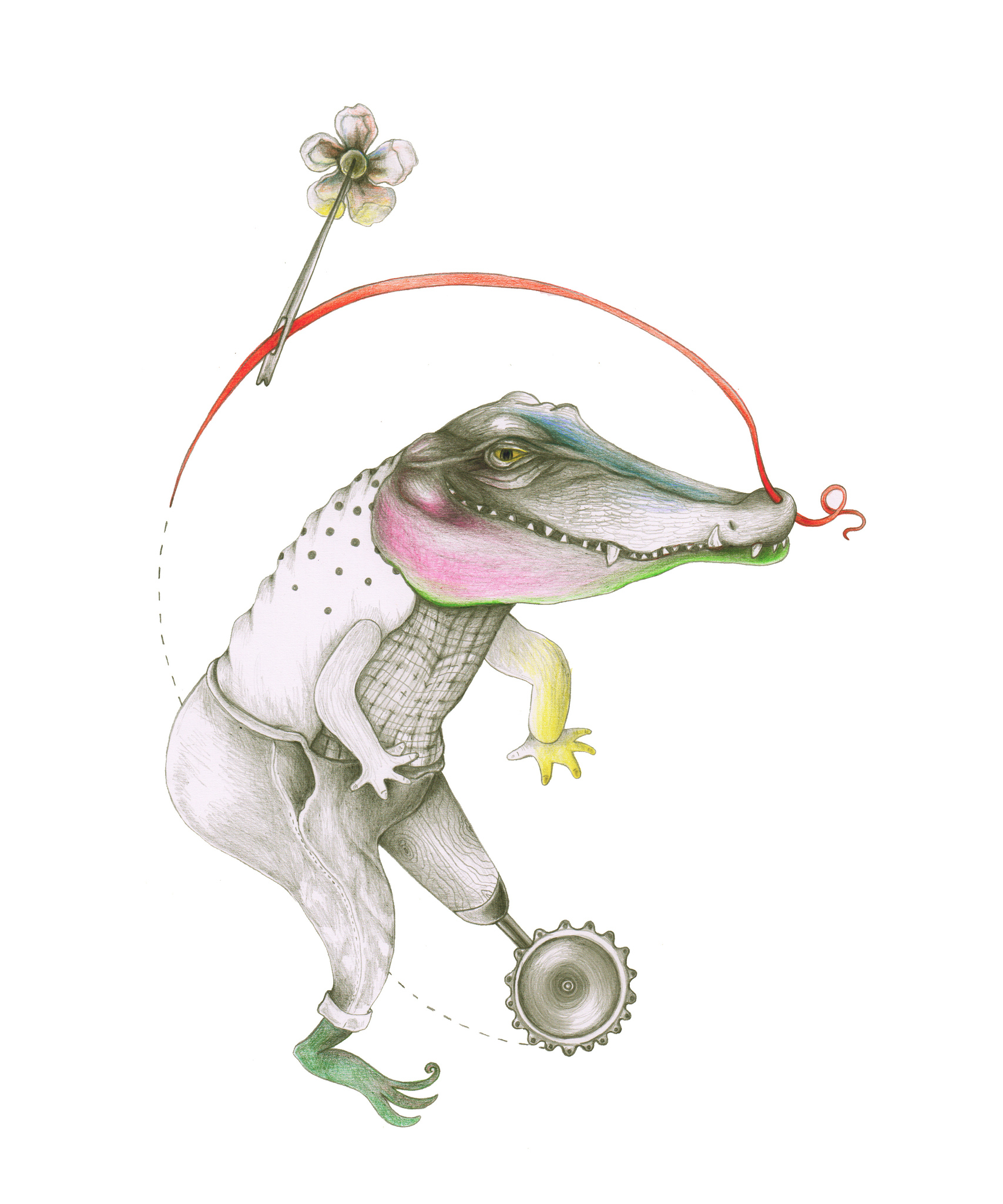 Fantasierijke (kleur)potloodtekening met allerlei surrealistische elementen.