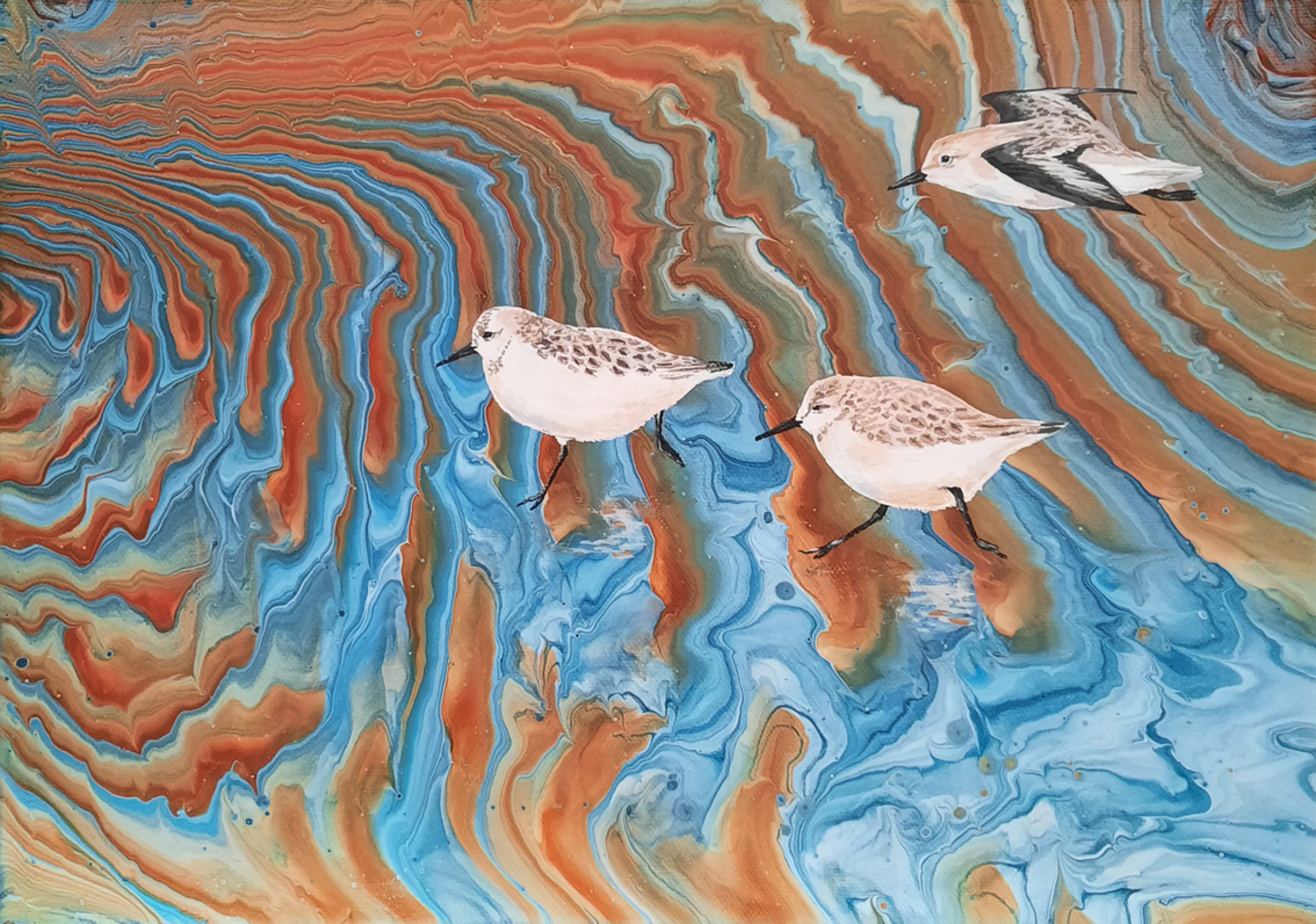 drieteenstrandlopers, acryl op canvas, ondergrond acryl pouring, geschilderd door Paulien, met daarop drieteenstrandlopers geschilderd door Annemarie, 32 x 24.