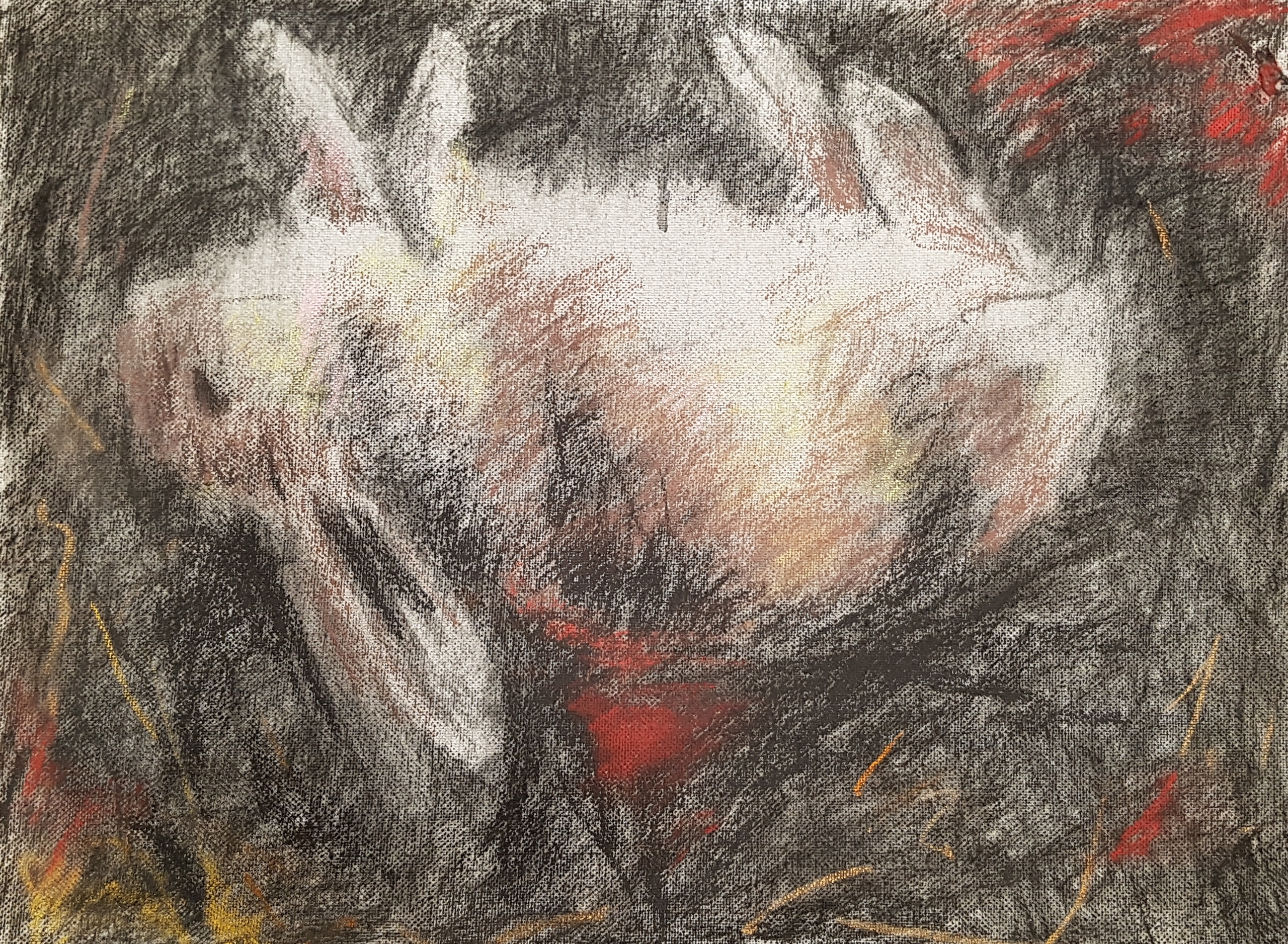 Een dood jong haasje, gevonden in een moerasgebied. Getekend op doek, heeft als schets 3 maanden weer en wind doorstaan, daarna uitgewerkt met pastelkrijt.