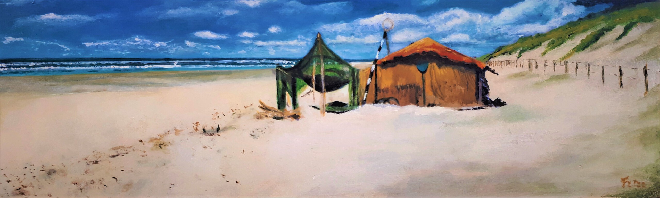 Visnetten. stro, bouwsels. vergezicht. Gezien in Wijk aan zee.