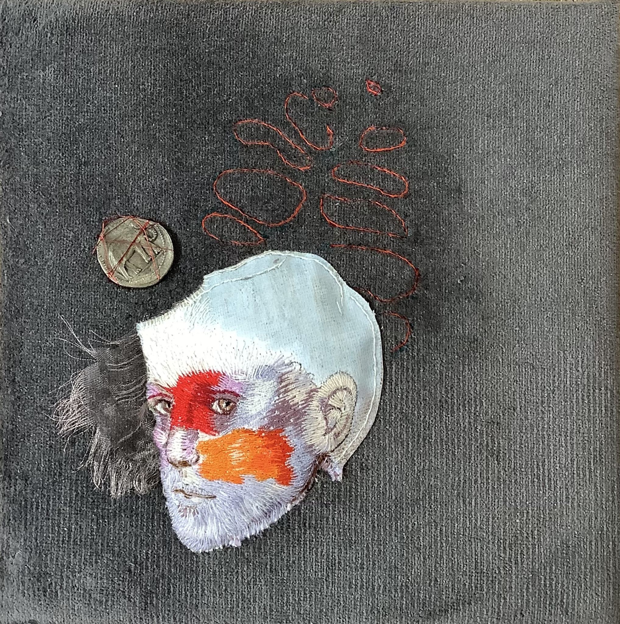 Dromen over een betere wereld. fluweel, applicatie, handborduur, munt.