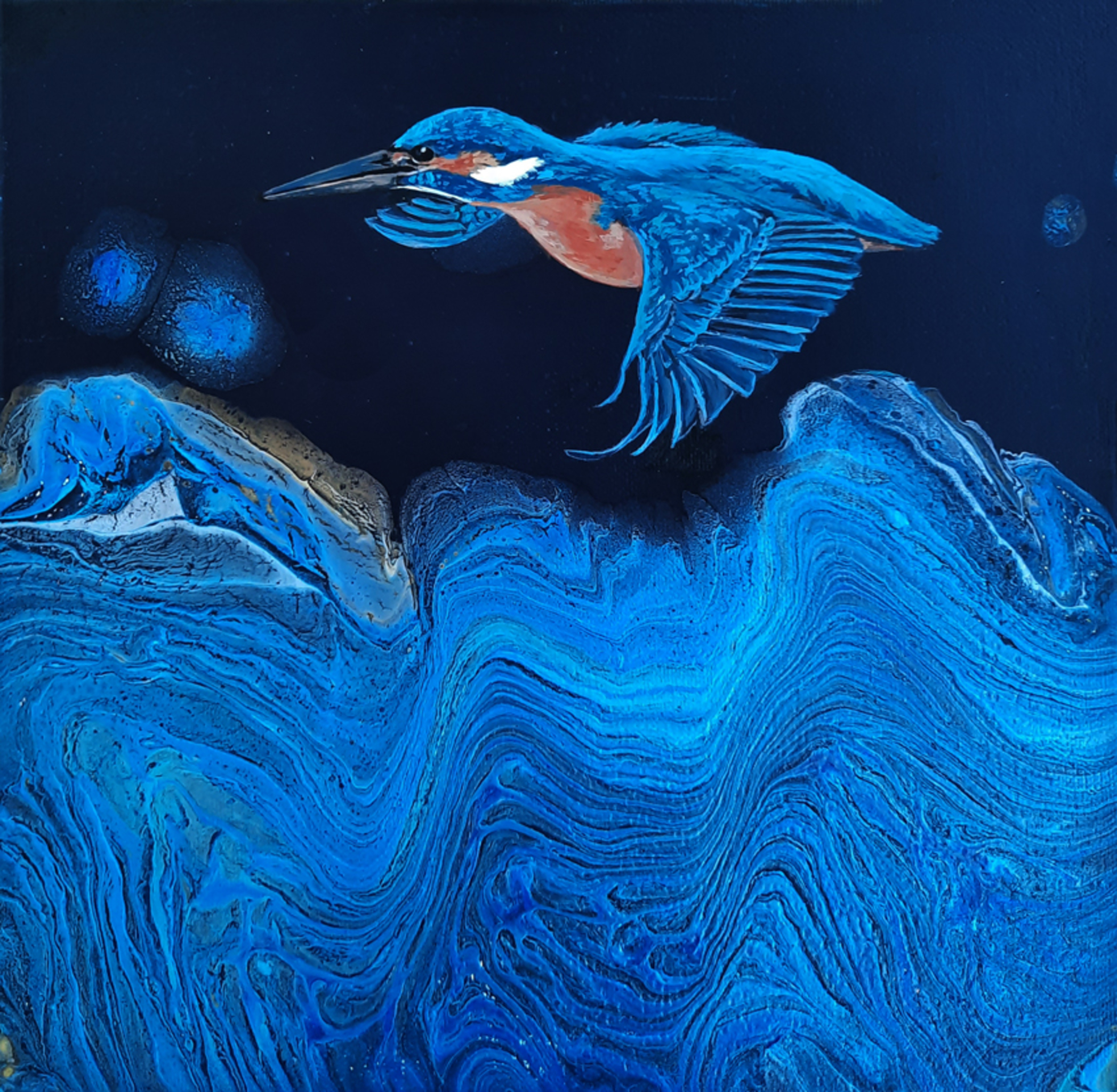 IJsvogel, acryl op canvas, ondergrond acryl pouring geschilderd door Paulien, met daarop een IJsvogel geschilderd door Annemarie, 30x 30 , 3 D