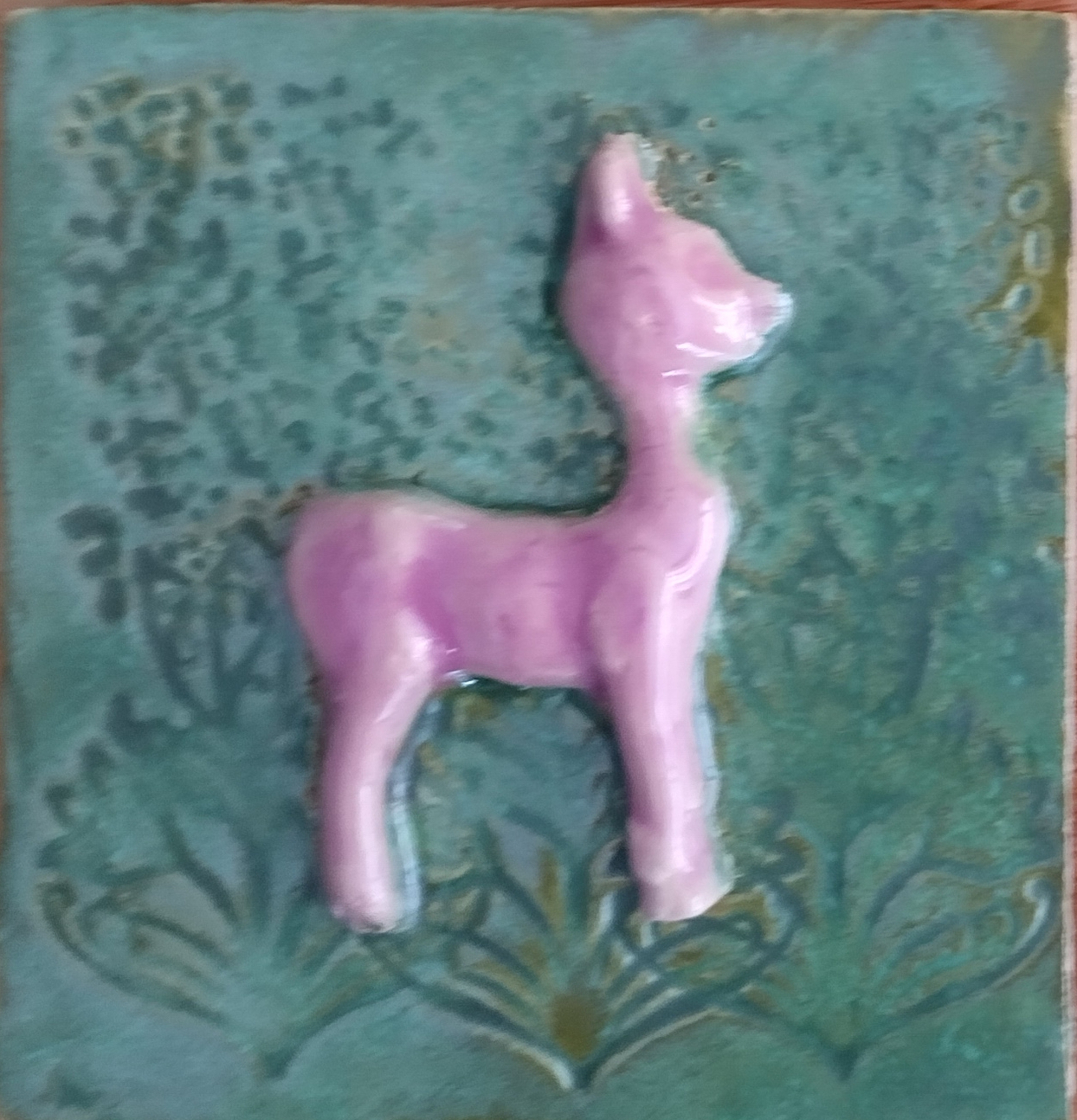 Tegeltje, handgevormd en geglazuurd. afmeting +/-10 bij 10 cm Groene achtergrond en lila Lama