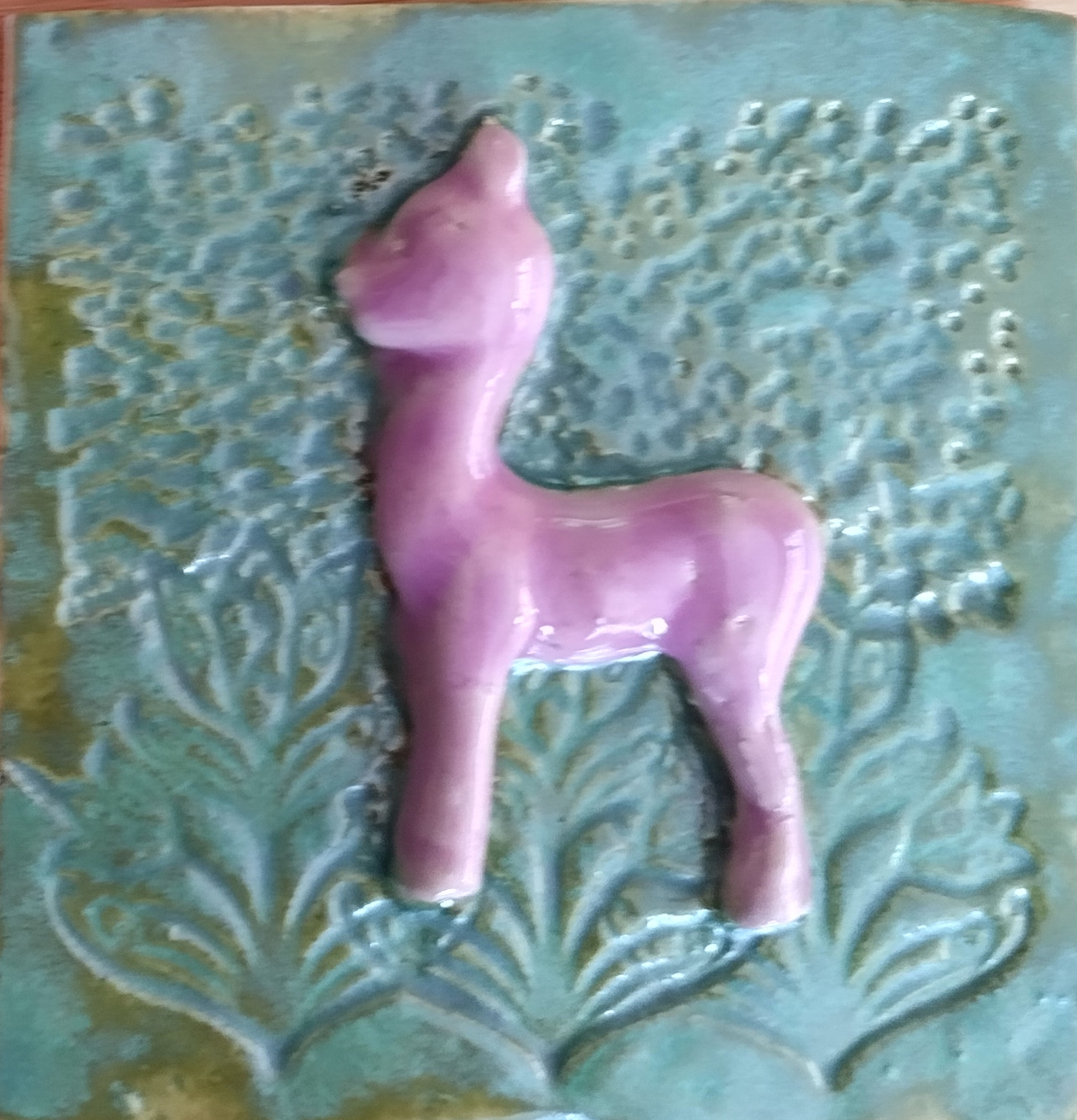 Tegeltje, handgevormd en geglazuurd. afmeting +/-10 bij 10 cm Groene achtergrond en lila Lama