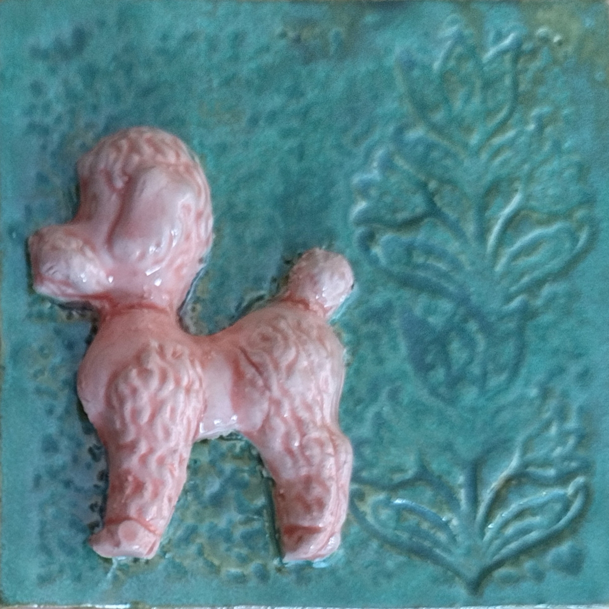 Tegeltje, handgevormd en geglazuurd. afmeting +/-10 bij 10 cm Groene achtergrond en roze poedel