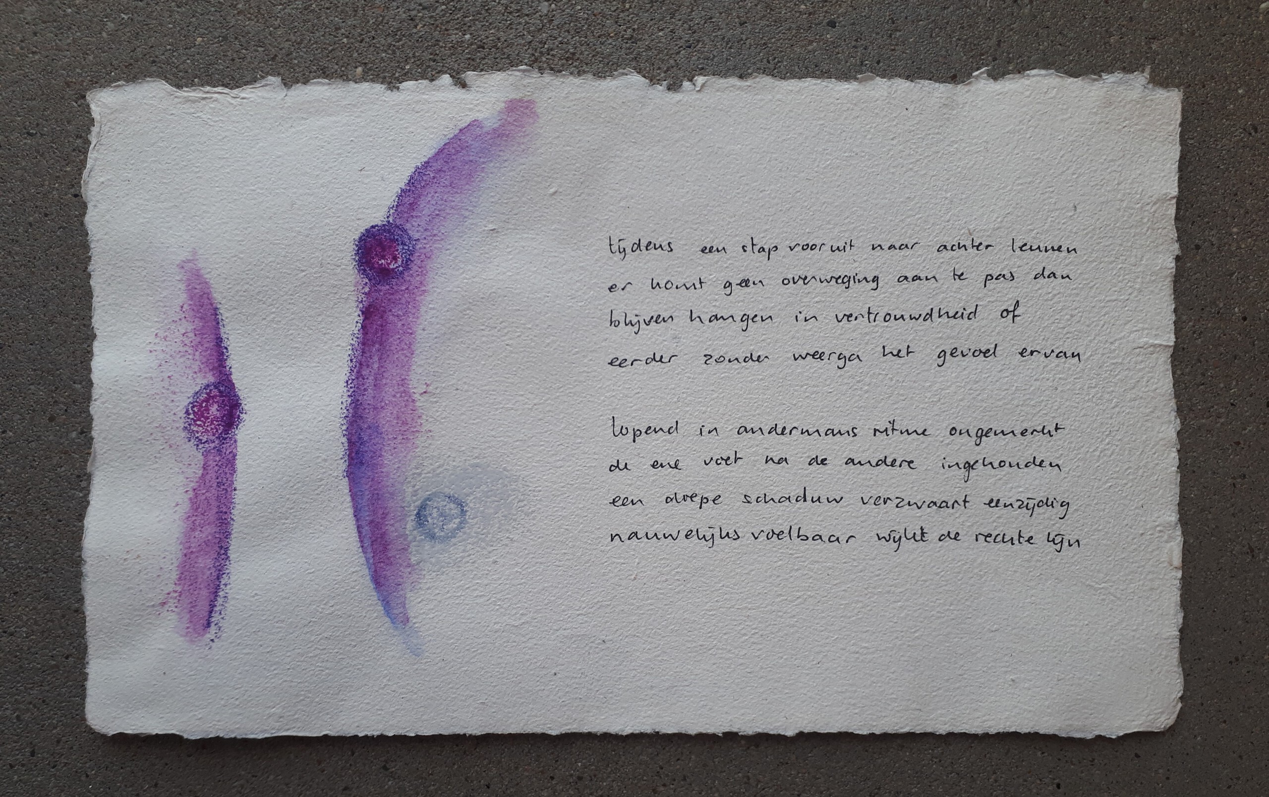 Autobiografisch gedicht vanuit eigen voetenwerk. Aquarel en pastel- en vetkrijt op handgeschept papier. Tekst in watervaste stift.