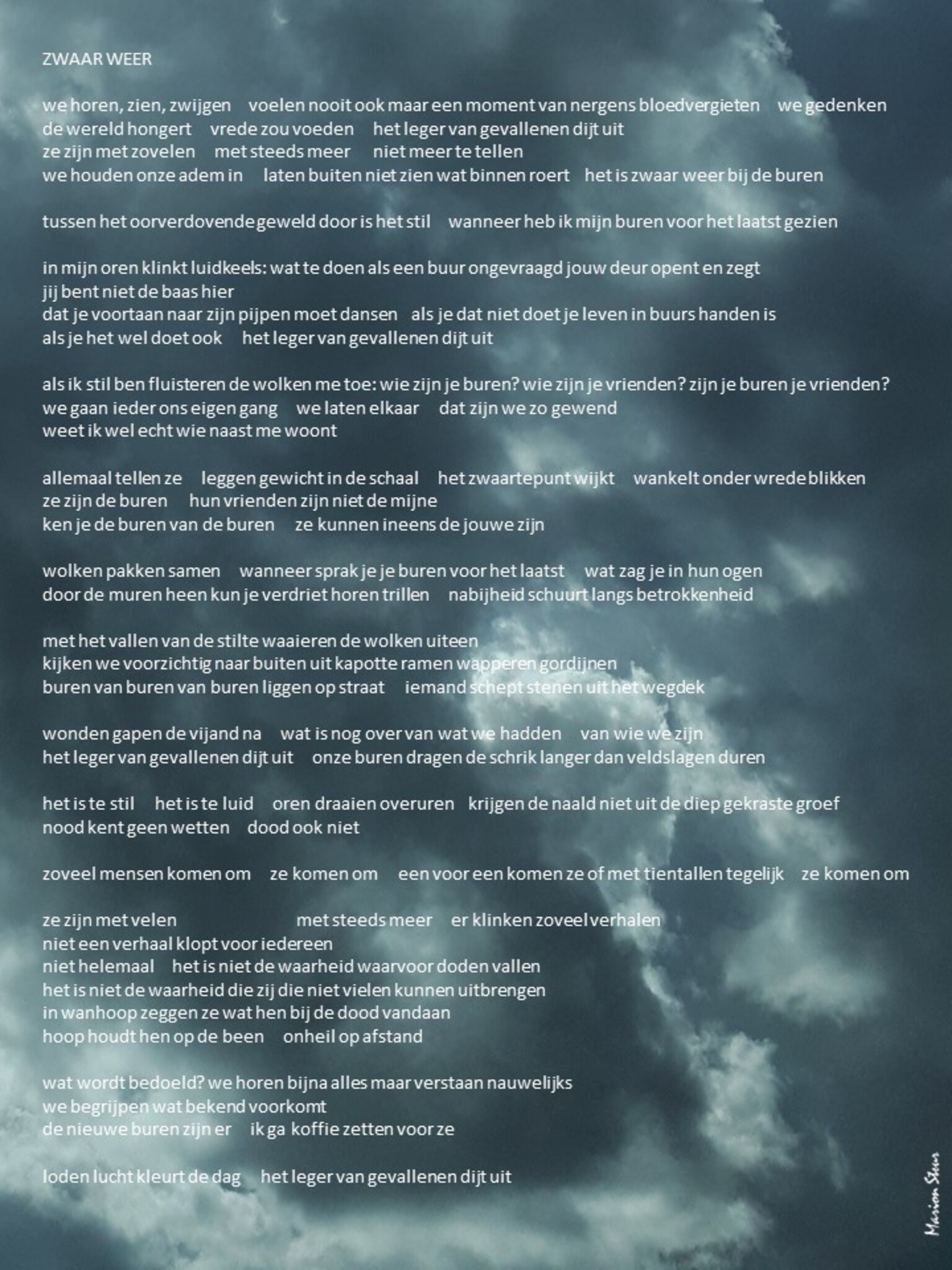 Gedicht ter gelegenheid van Dodenherdenking 2022. Het nationale Comité 4 en 5 mei had als thema Vrijheid in verbondenheid gekozen. De oorlog in Oekraïne gaf dit perspectief nog meer nadruk. Op verzoek van het Comité 4 en 5 mei Doesburg schreef ik ZWAAR WEER voor de Dodenherdenking op 4 mei 2022, Doesburg TV legde de bijeenkomst mooi vast op https://www.youtube.com/watch?v=Xsh5phPXkYE. ZWAAR WEER vanaf 1:00:00.