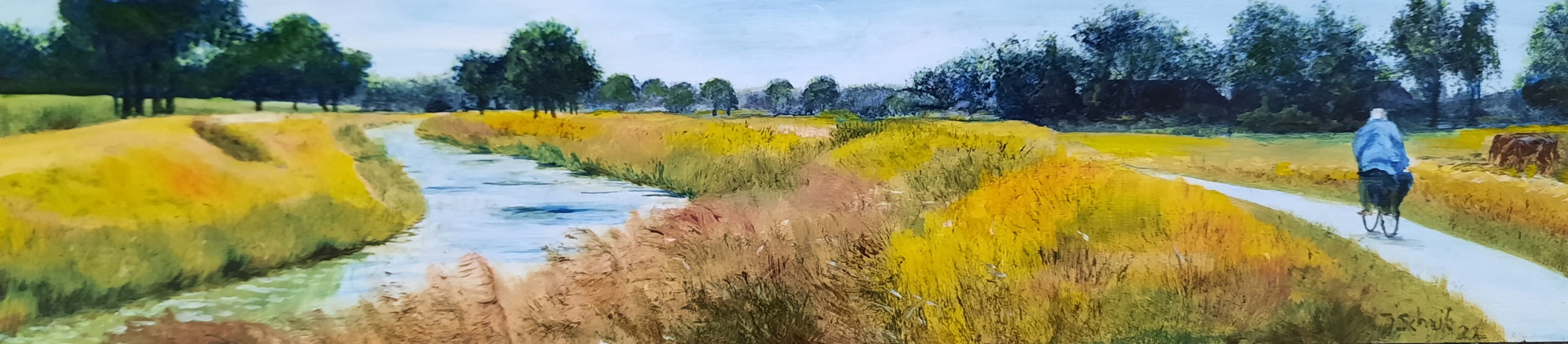Na een hete periode is er eindelijk wat regen. De Doorbraak ligt er wel mooi bij. De fietser heeft zijn regencape maar aangetrokken.