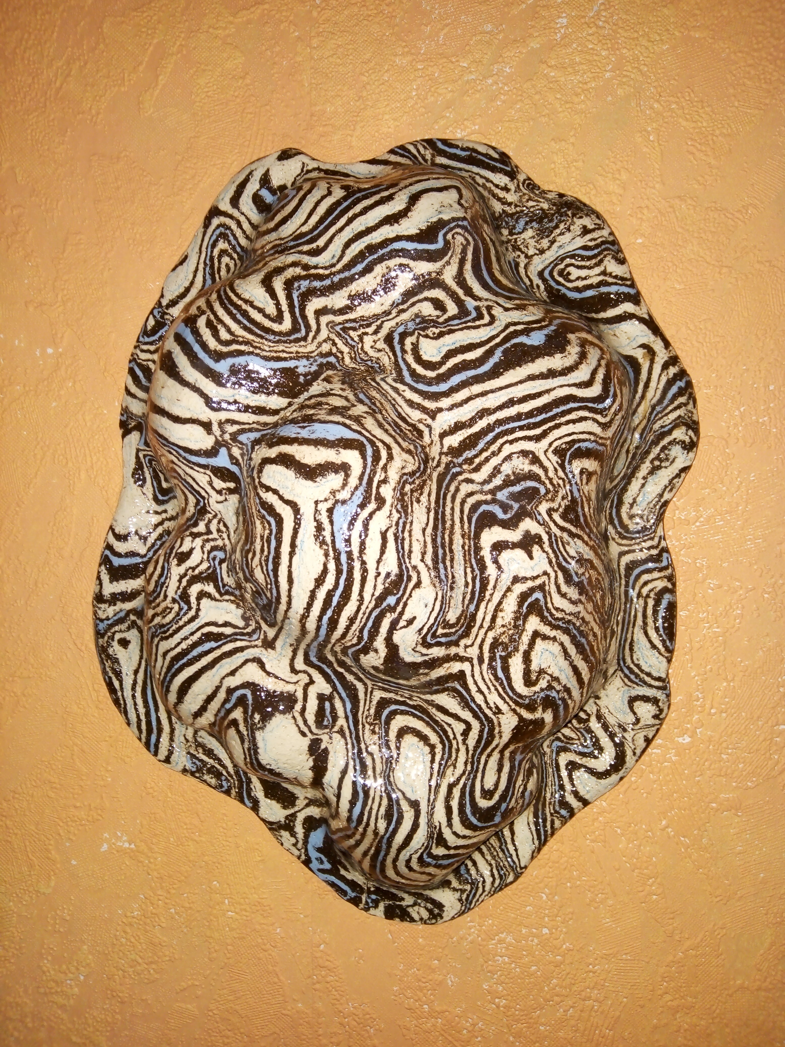 Keramiek : organische handgevormde objecten dmv slabs afgedrukt op linosnede.