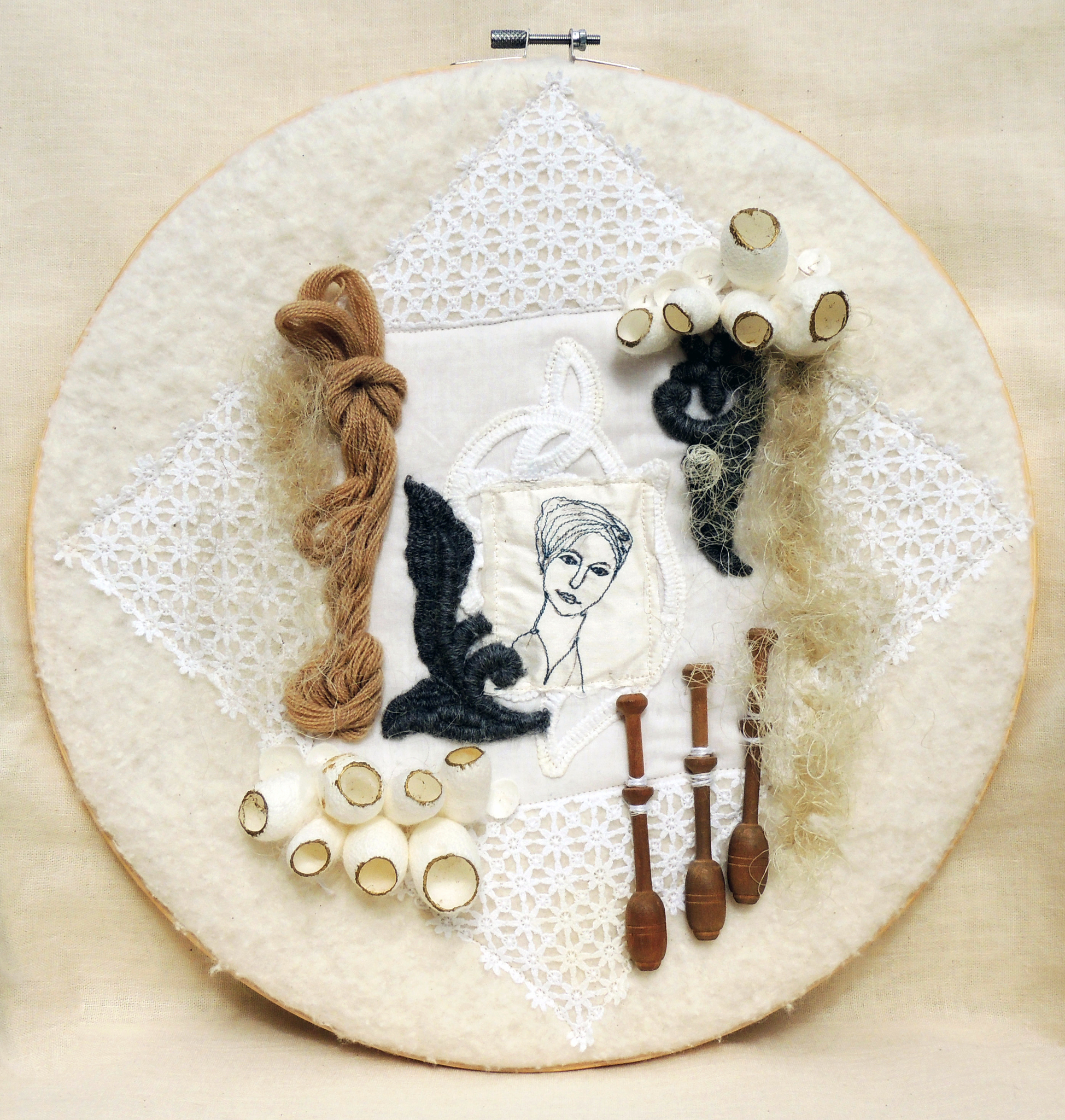Handwerk van vroeger en een mooie vrouw gemaakt met de naaimachine. Ode aan al die vrouwen die het mooie handwerk maakten vroeger en nu. omringt door kandklosjes, cocons van de zijderups, zijde, kantoenen ondergrond en een mooi kanten kleedje