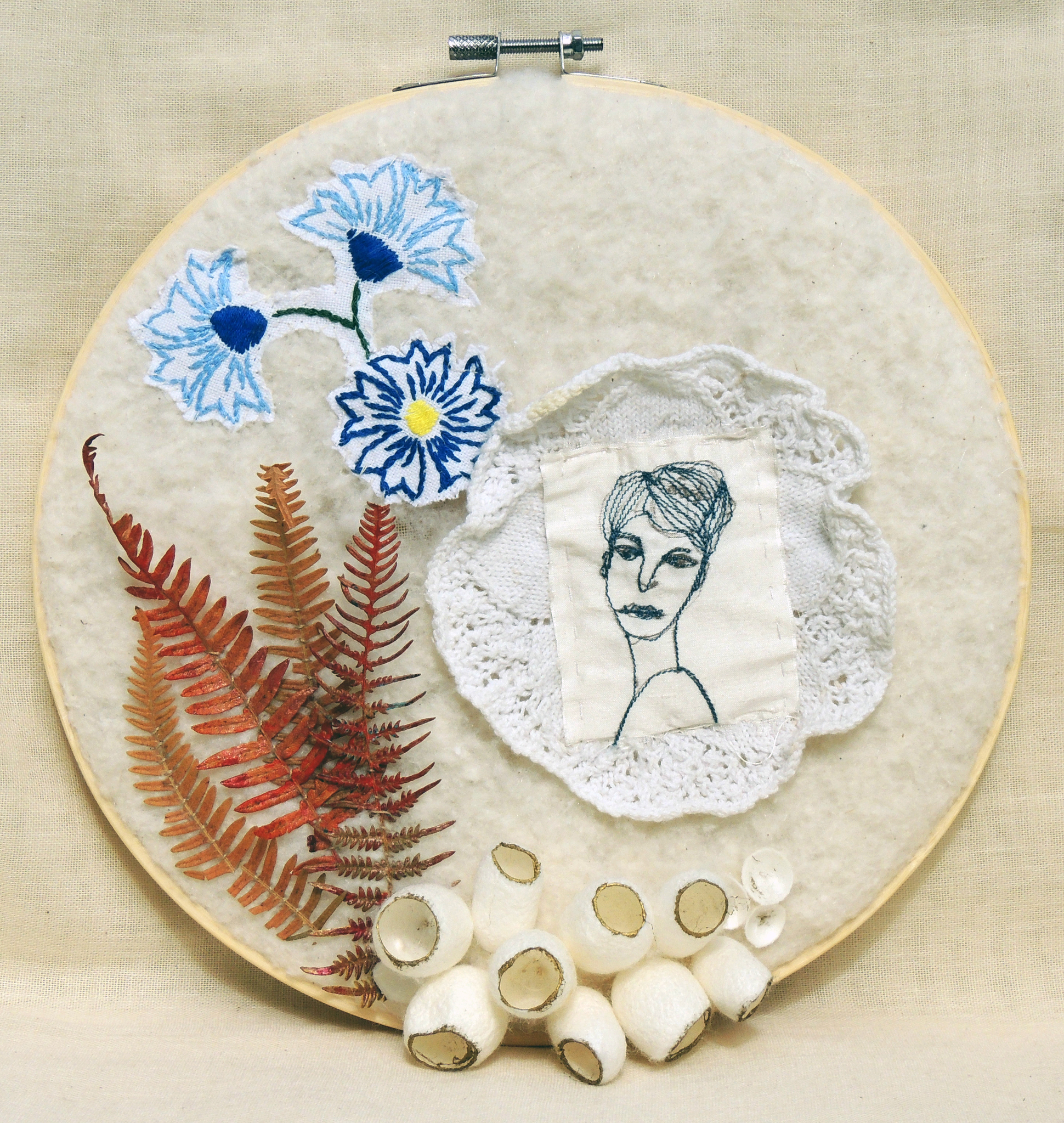 Mooie vrouw gemaakt op zijde met de naaimachine, omringt met handwerk, ode aan al die vrouwen die al dat mooie handwerk hebben gemaakt.