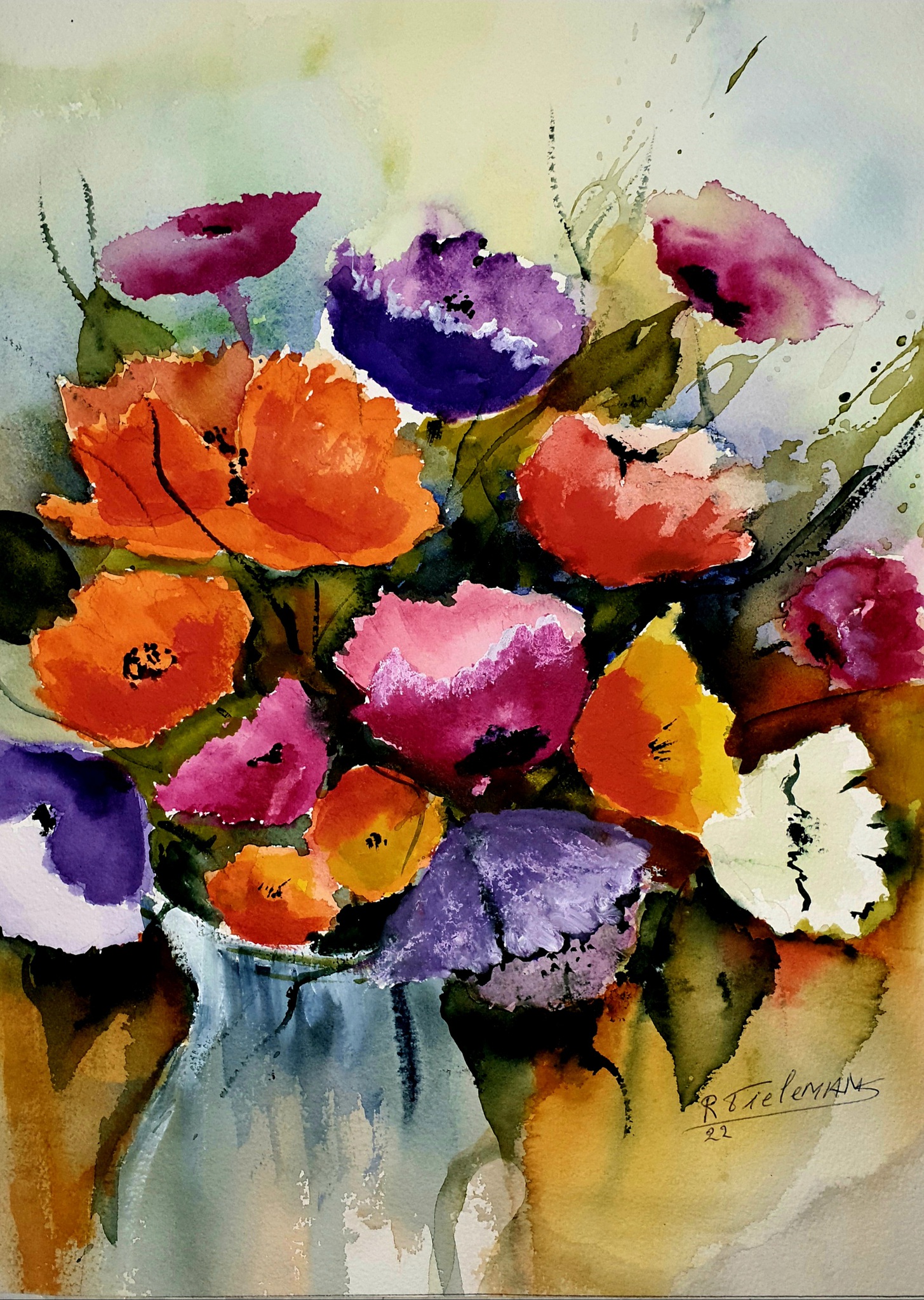 Dit is een prachtige aquarel van een boeket bloemen! De levendige kleuren van de bloemen – oranje, paars, roze en geel – springen er echt uit en geven de compositie een energieke en vrolijke uitstraling. De losse penseelstreken en het gebruik van waterige verf geven het schilderij een speels en expressief karakter. De subtiele achtergrond, met zachte overgangen en lichte tinten, zorgt ervoor dat de bloemen centraal staan zonder af te leiden. Het geheel heeft een mooie balans tussen abstractie en herkenbaarheid.