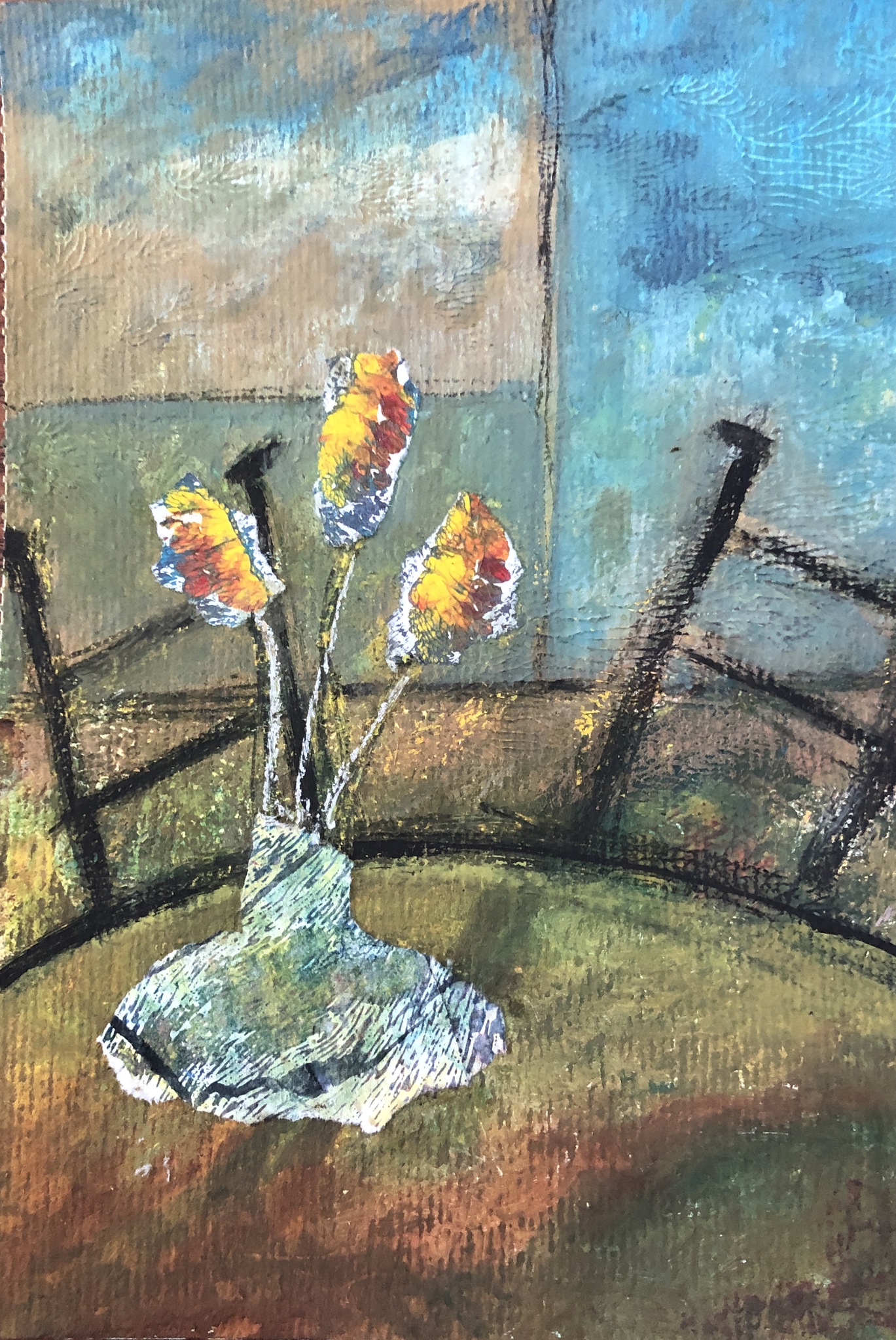 Stilleven Interieur Collage Gouache Vaas Bloemen Stoelen