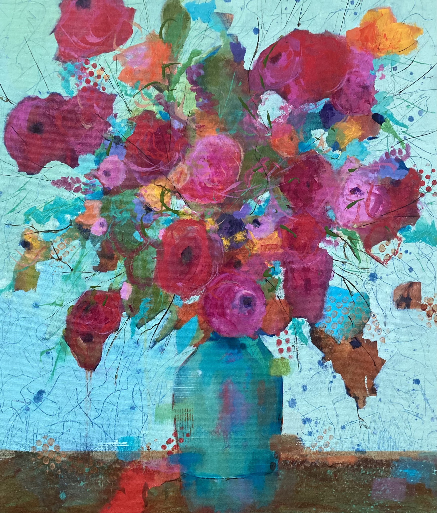 Rood Groen Bloemen Vaas Geabstraheerd Flowers Boeket Donkerrood Impressionistisch Vase Flowerpainting Rosé