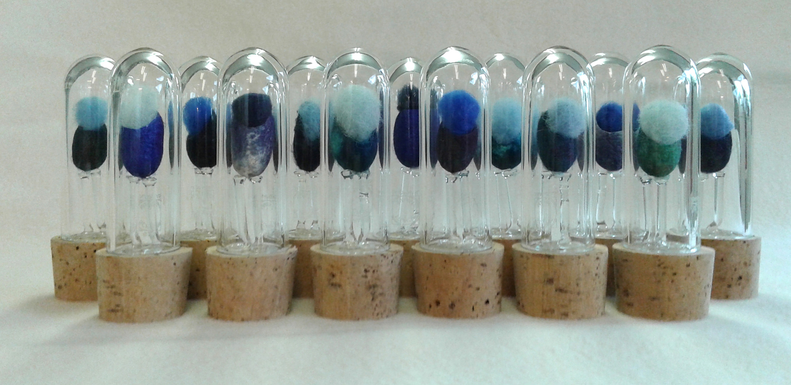 zijderupscocon, wol, glas, kurk, oud laboratorim glaswerk