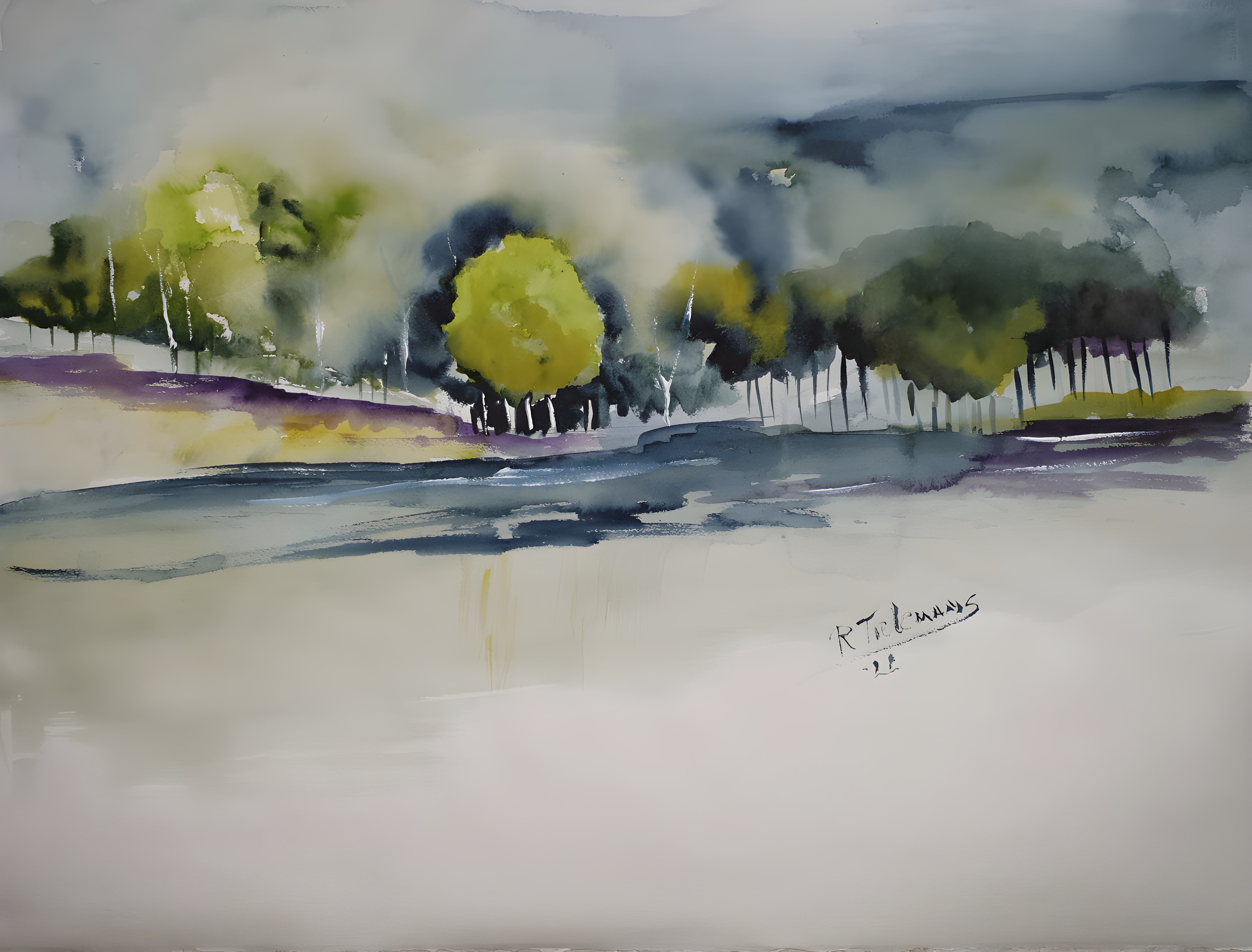 Kunstprinten van dit werk zijn ook verkrijgbaar op: https://www.werkaandemuur.nl/nl/shopwerk/Bosrand/1469215 Deze aquarel ademt een dromerige, bijna etherische sfeer uit, waarin de grens tussen realiteit en abstractie subtiel vervaagt. De zachte, vloeiende penseelstreken suggereren een landschap dat baadt in een nevelige ochtendmist, met bomen die als vage silhouetten opdoemen uit een wazige achtergrond. De kleuren zijn delicaat en harmonieus: diepe groenen en warme geeltinten brengen het bladerdak tot leven, terwijl de ondergrondse reflecties een bijna spiegelend effect creëren. In het midden van de compositie trekt een prominente boom de aandacht, zijn bladerkroon lichter en stralender dan de omringende flora, alsof het zonlicht er net doorheen breekt. De horizonlijn is niet scherp gedefinieerd, waardoor een gevoel van oneindigheid en rust ontstaat. De paarse en blauwe tinten in de onderste helft suggereren een waterpartij of een open vlakte, een leegte die de kijker uitnodigt om zelf invulling te geven aan het landschap. Het geheel straalt een gevoel van sereniteit uit, alsof de tijd even stil lijkt te staan in deze poëtische, impressionistische weergave van de natuur.