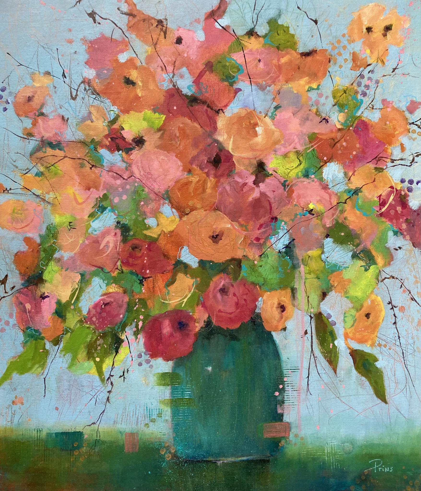 In de serie bloemen een boeket geinspireerd door de kleuren van de lente. In vele lagen en met diverse technieken geschilderd. Een feestje aan jouw muur!