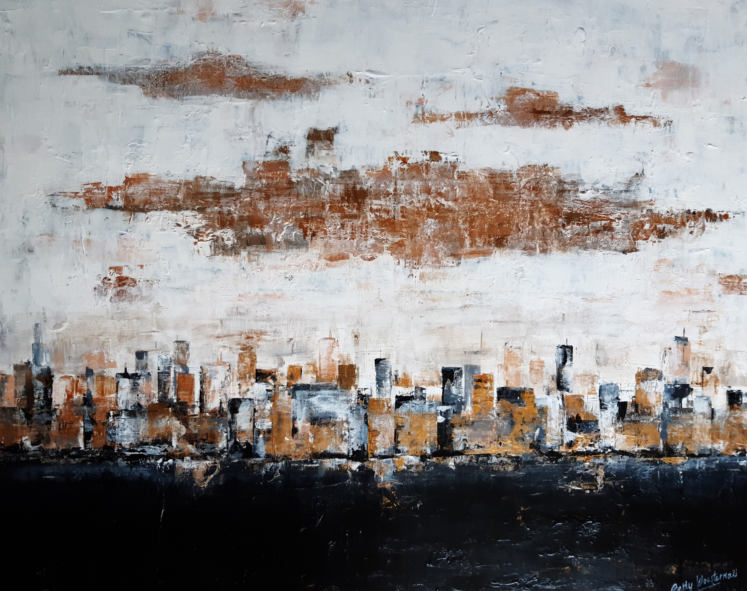 "Citylife" Acrylschilderij opgebouwd in lagen met een poederachtige uitstraling. Goud met overschildering voor een chique effect zonder dat het teveel wordt.