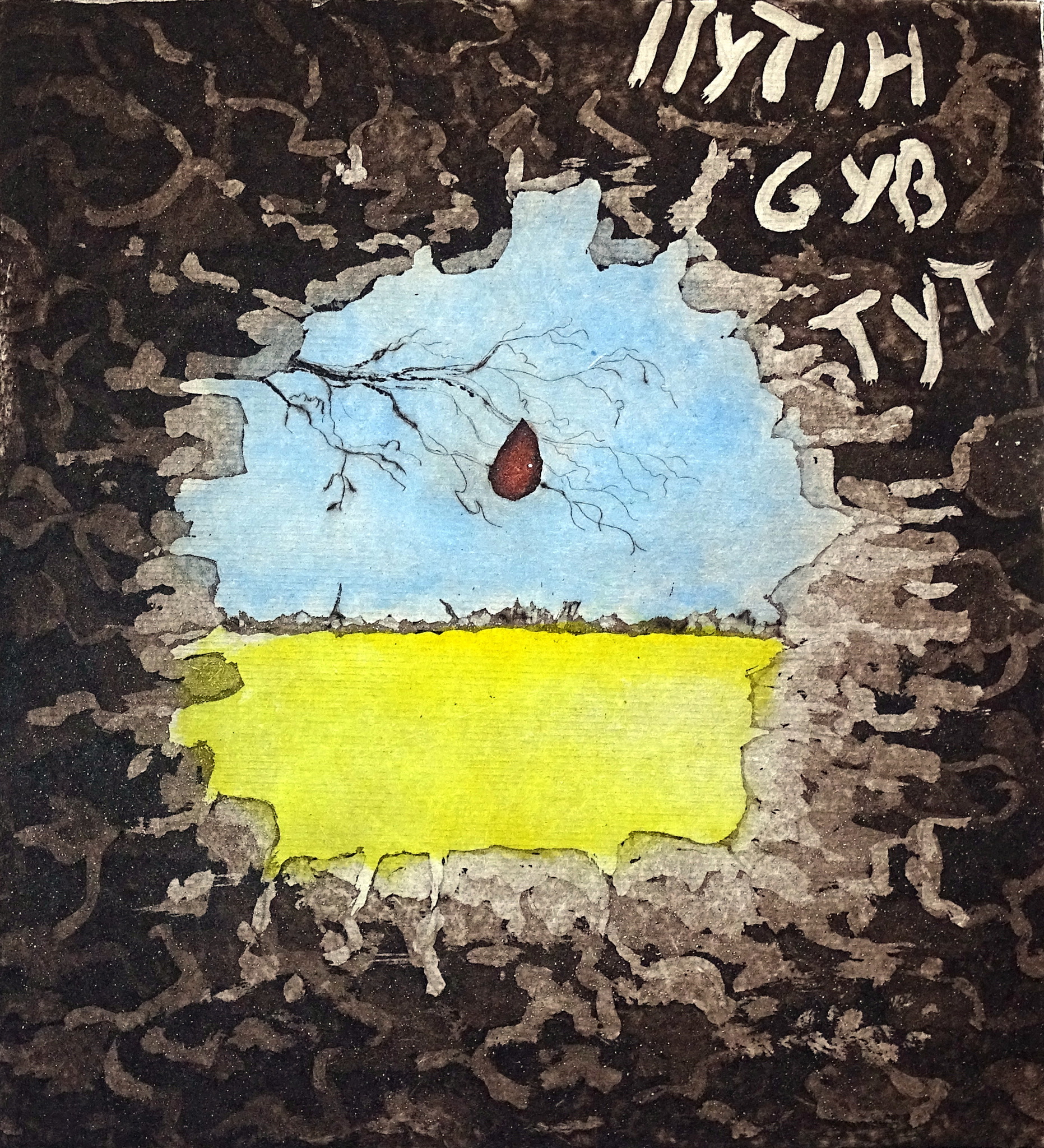 deze aquatint dubbeldruk geeft een uitzicht weer door een stukgeschoten oude muur, waar iemand "poetin was here"op heeft gespoten. Het uitzicht is troosteloos, vlak geel met blauwe lucht ( vlag Oekraine) . Aan een verdorde tak hangt nog een druppel bloed, symbool voor het lijdende land. Deze dictator, gaat hij door tot de laatste bewoner is overleden? Omega is het laatste woord in het griekse alfabet, het einde. Het omega - symbool vind u terug in de verdorde tak. Dit werk wordt op de expo aangeboden in een oplage van 20 stuks voor de prijs van € 90. Hiervan gaat per werk € 50 naar de hulpverlening in Oekraine.