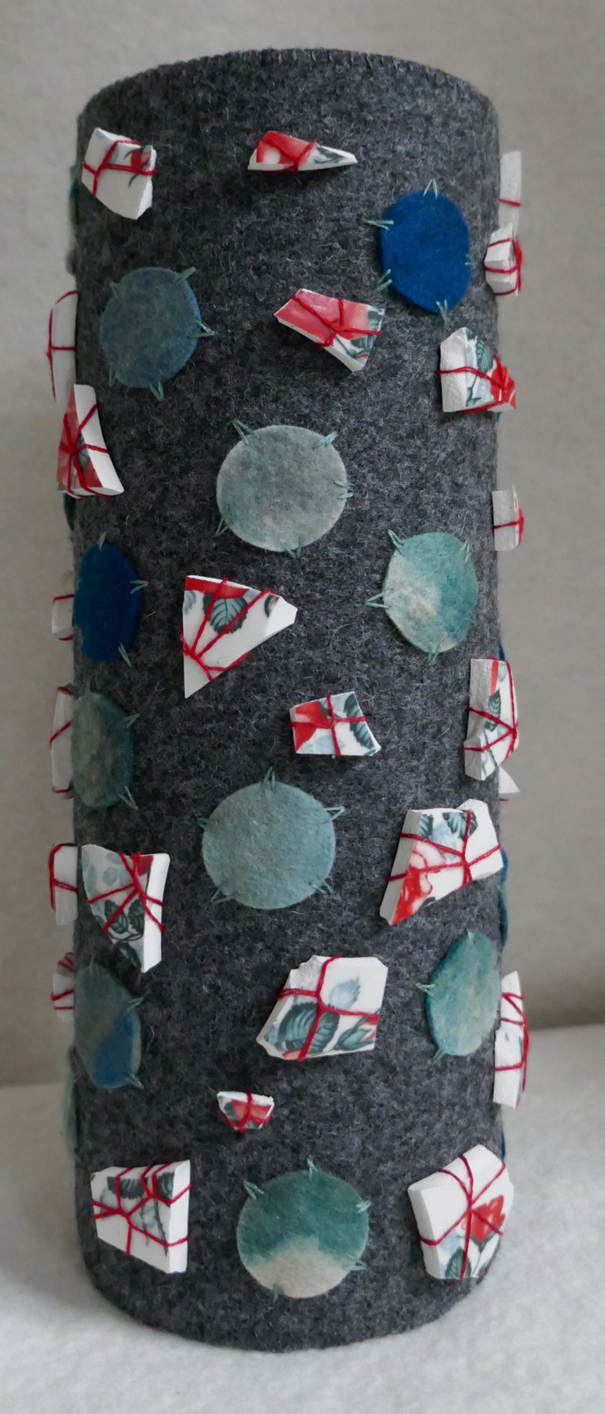 Deels handgeverfd vilt, keramiek, borduurzijde, glas.
