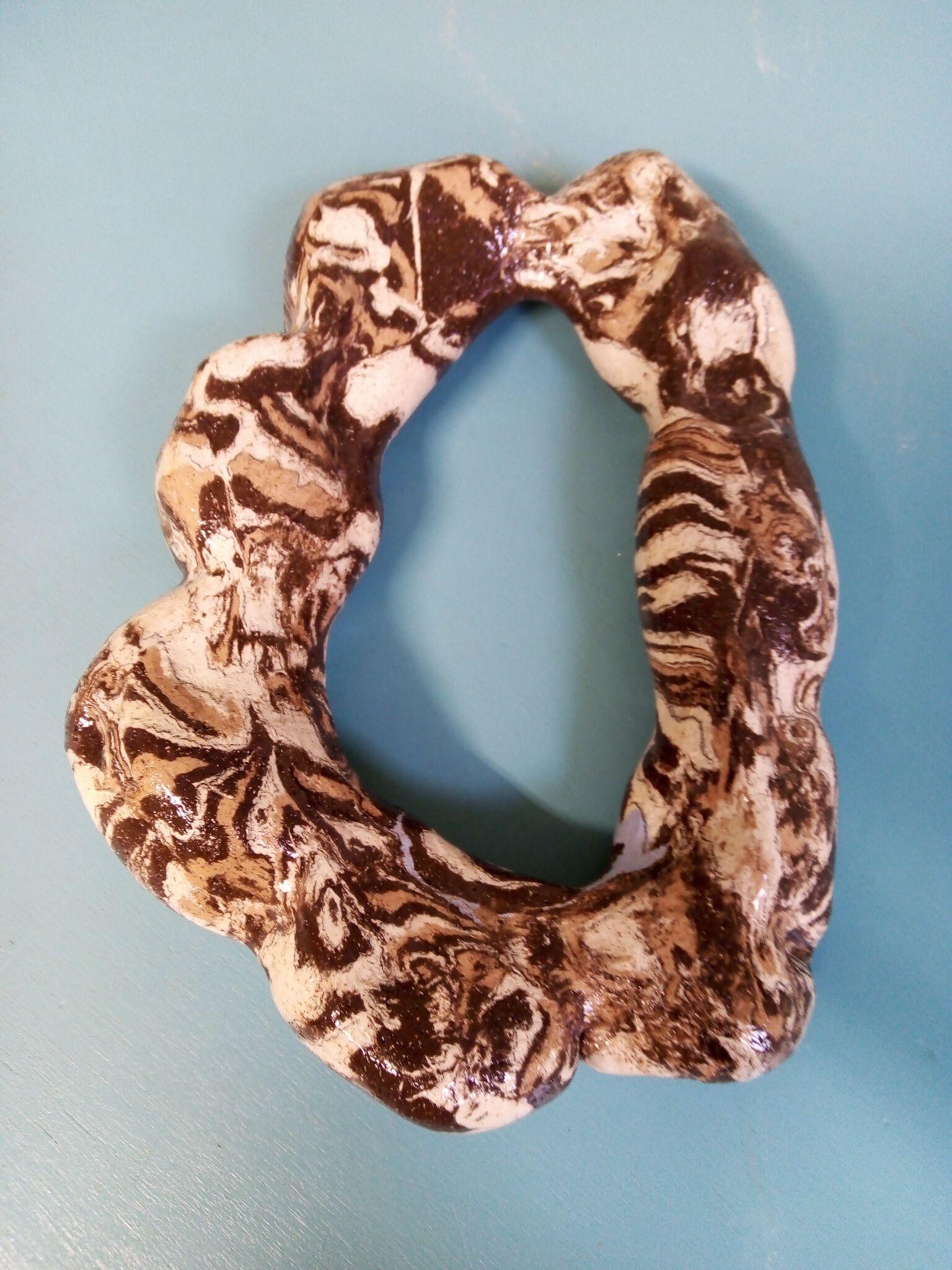 Keramiek : organische handgevormde objecten dmv slabs afgedrukt op linosnede.