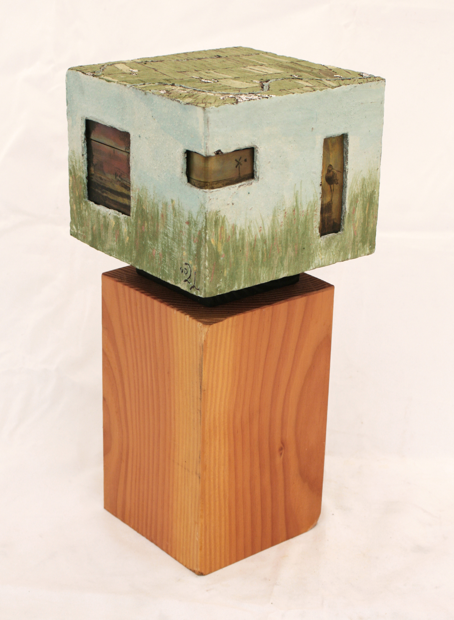 Het polderlandschap Eemland wordt op deze kubus verbeeld in keramiek ingelegd met messing plaatjes die weer bedrukt zijn. De bovenkant is een bovenaanzicht van de polder.