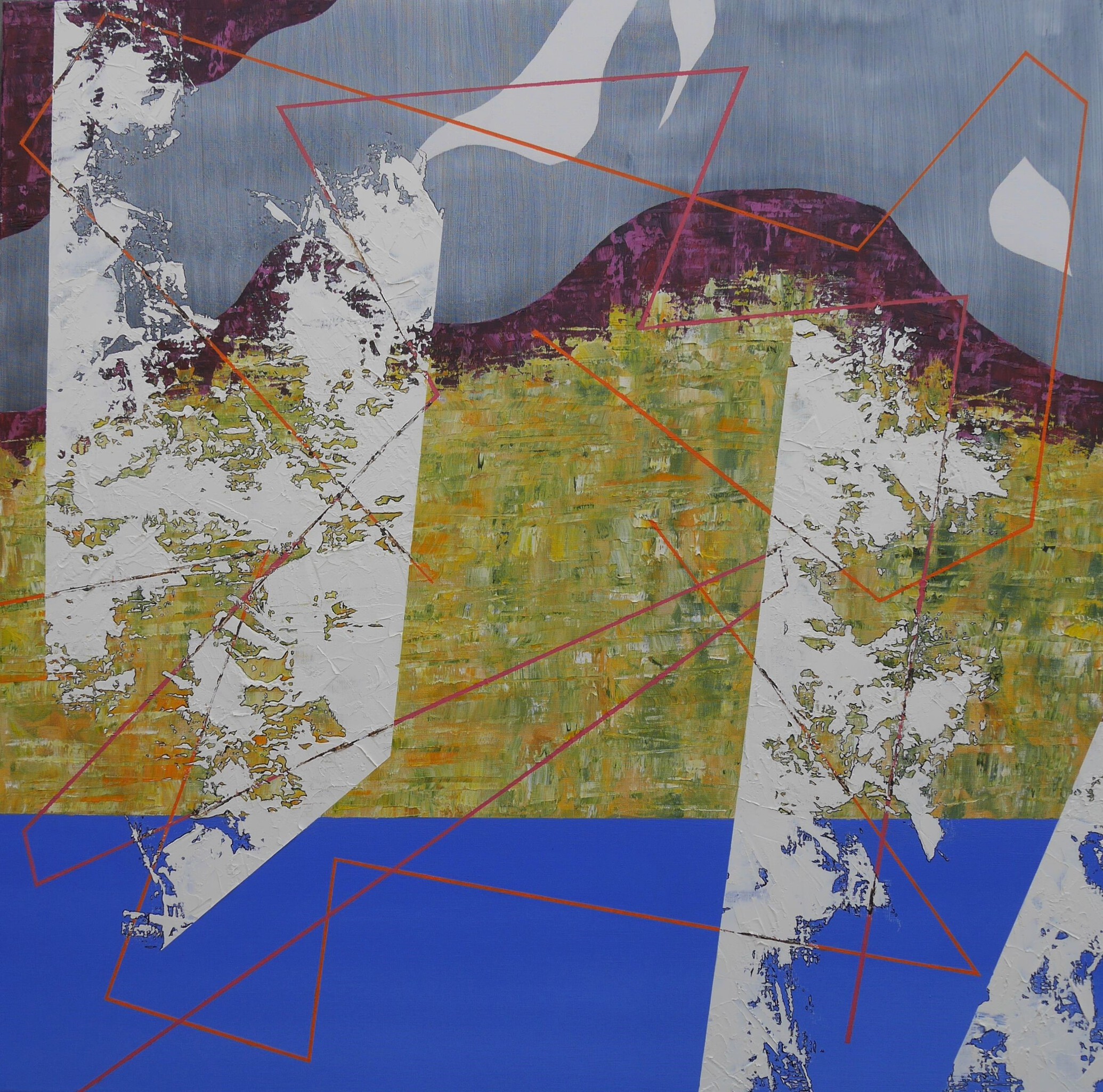 Abstract schilderij uitgevoerd in Olieverf en Inkt op Linnen. Mijn werken zijn geïnspireerd op de natuur en/of architectuur. Ingelijst in een stalen baklijst en gesigneerd.