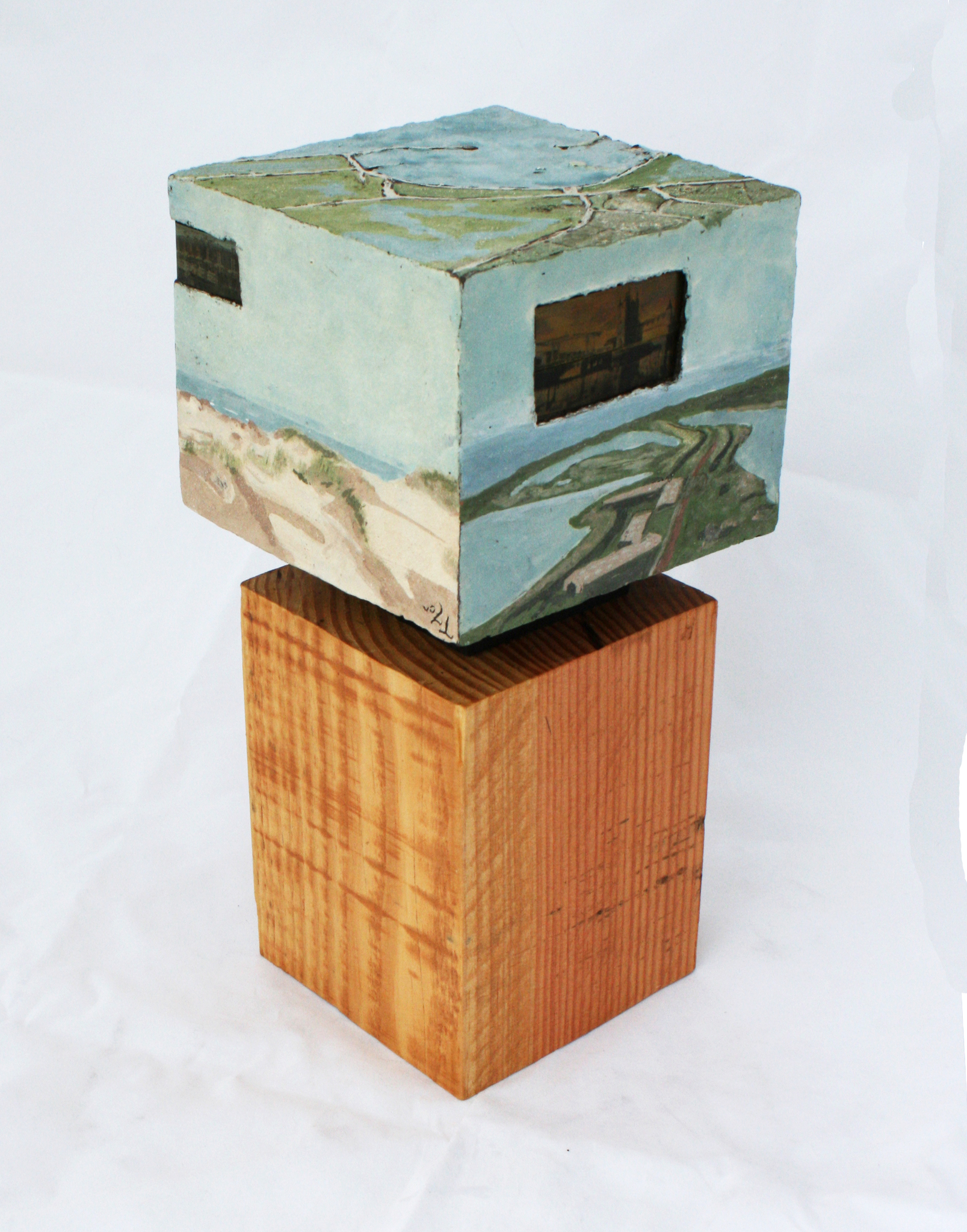 Het landschap van Schouwen Duiveland wordt op deze kubus verbeeld in keramiek ingelegd met messing plaatjes die weer bedrukt zijn. De bovenkant is een bovenaanzicht van een stukje van het eiland.