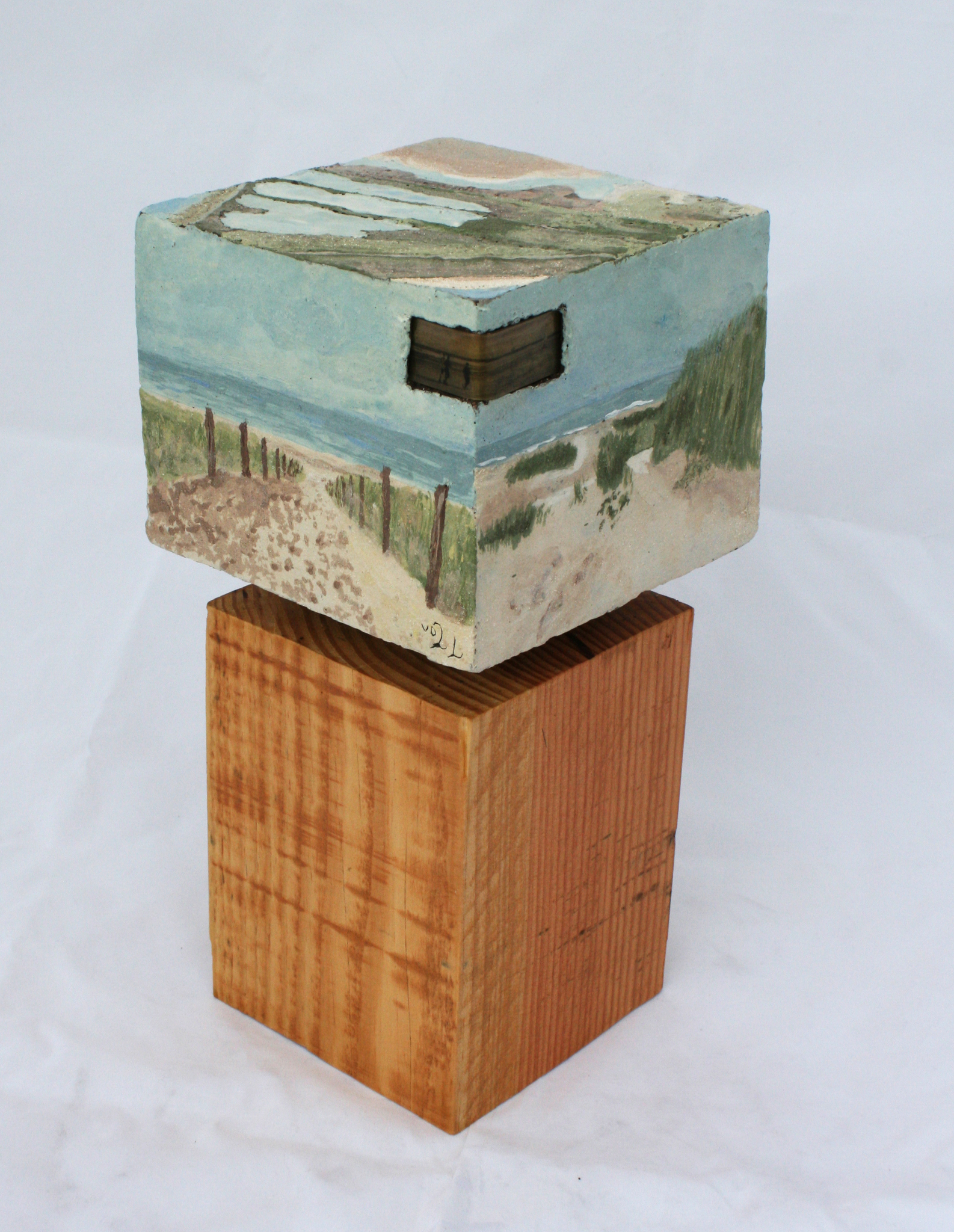 Het landschap van Vlieland wordt op deze kubus verbeeld in keramiek ingelegd met messing plaatjes die weer bedrukt zijn. De bovenkant is een bovenaanzicht van een stukje van het eiland.