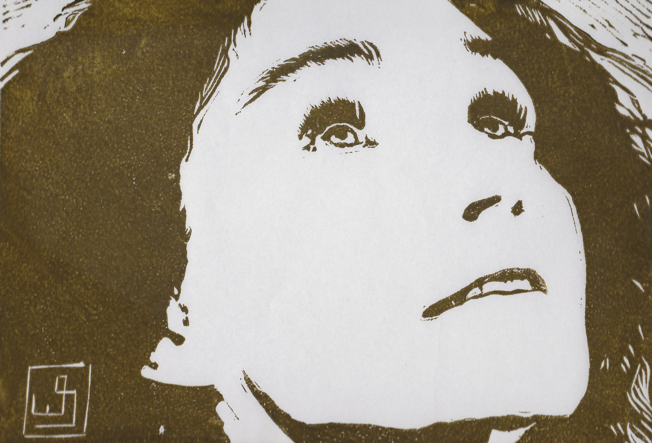 Portret MvO. Lino snede gedrukt in inkt op 45 g/m2 Vang Linolblock handgeschept japanpapier. Afbeelding 20 cm x 30 cm Papier 46 cm x 31 cm