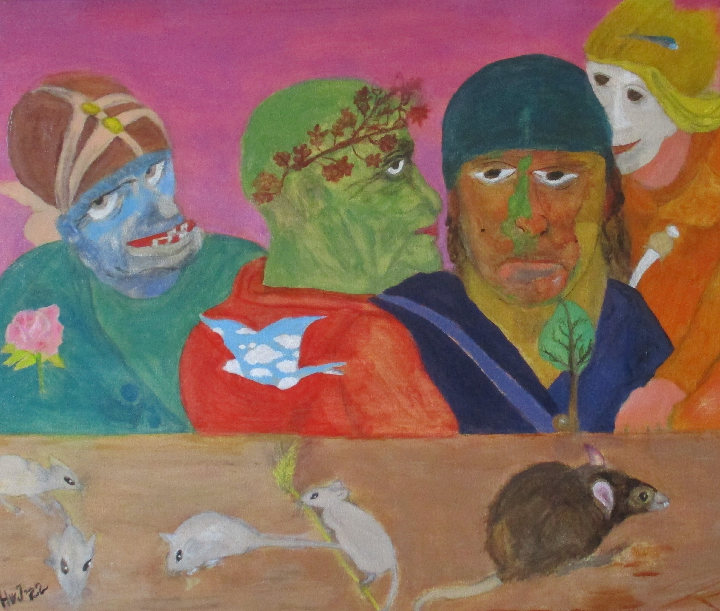 Een vrouwelijke en drie mannelijke koppen, enigzins naar schilderijen van Leonardo da Vinci. Een drietal symbolen (bloem, vogel, boom) naar René Magritte, en verder muizen en een rat op de onderzijde.
