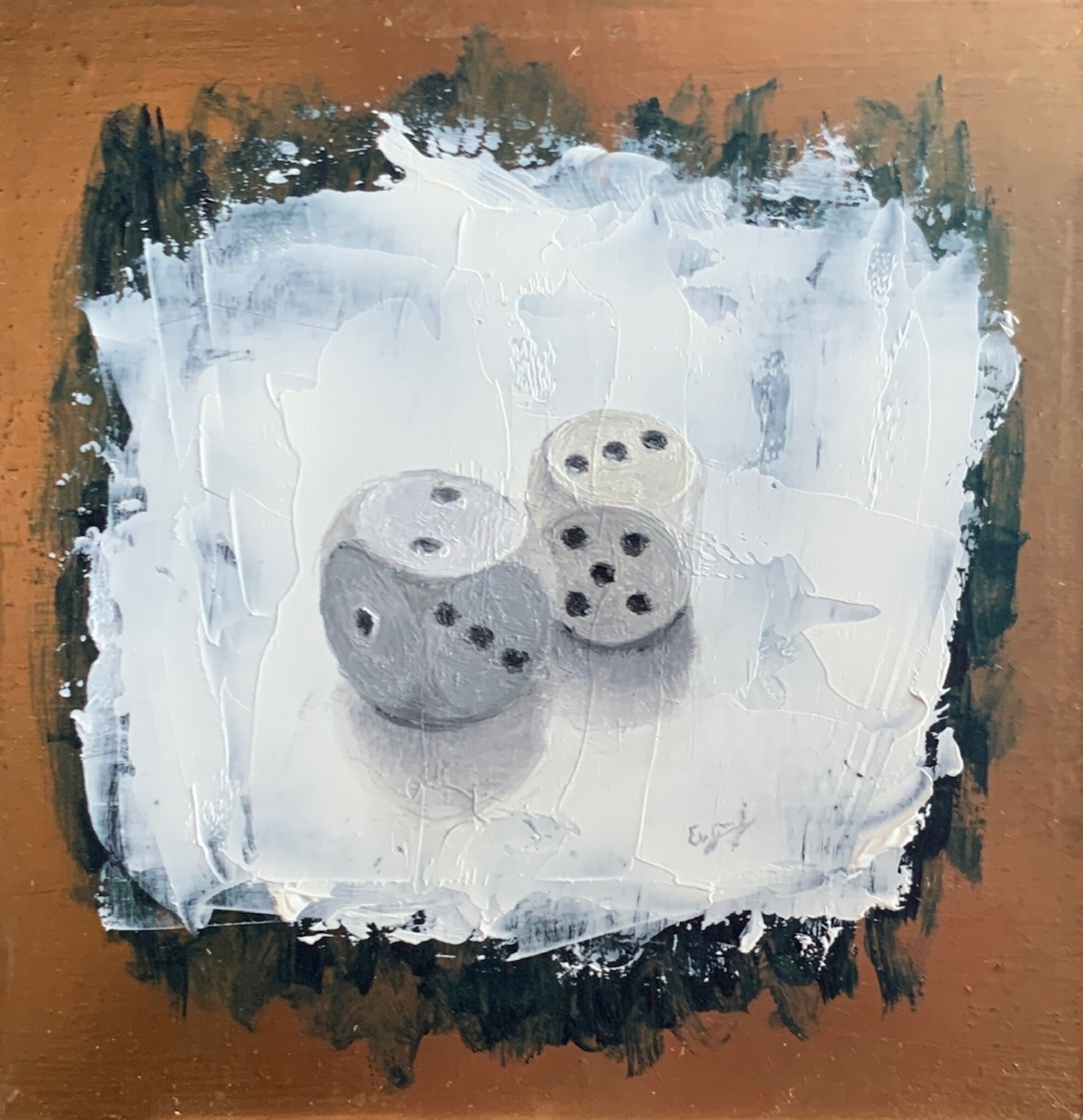 Dit werkje spreekt voor zich. Tegen een gouden achtergrond steken de kille dobbelstenen schril af.