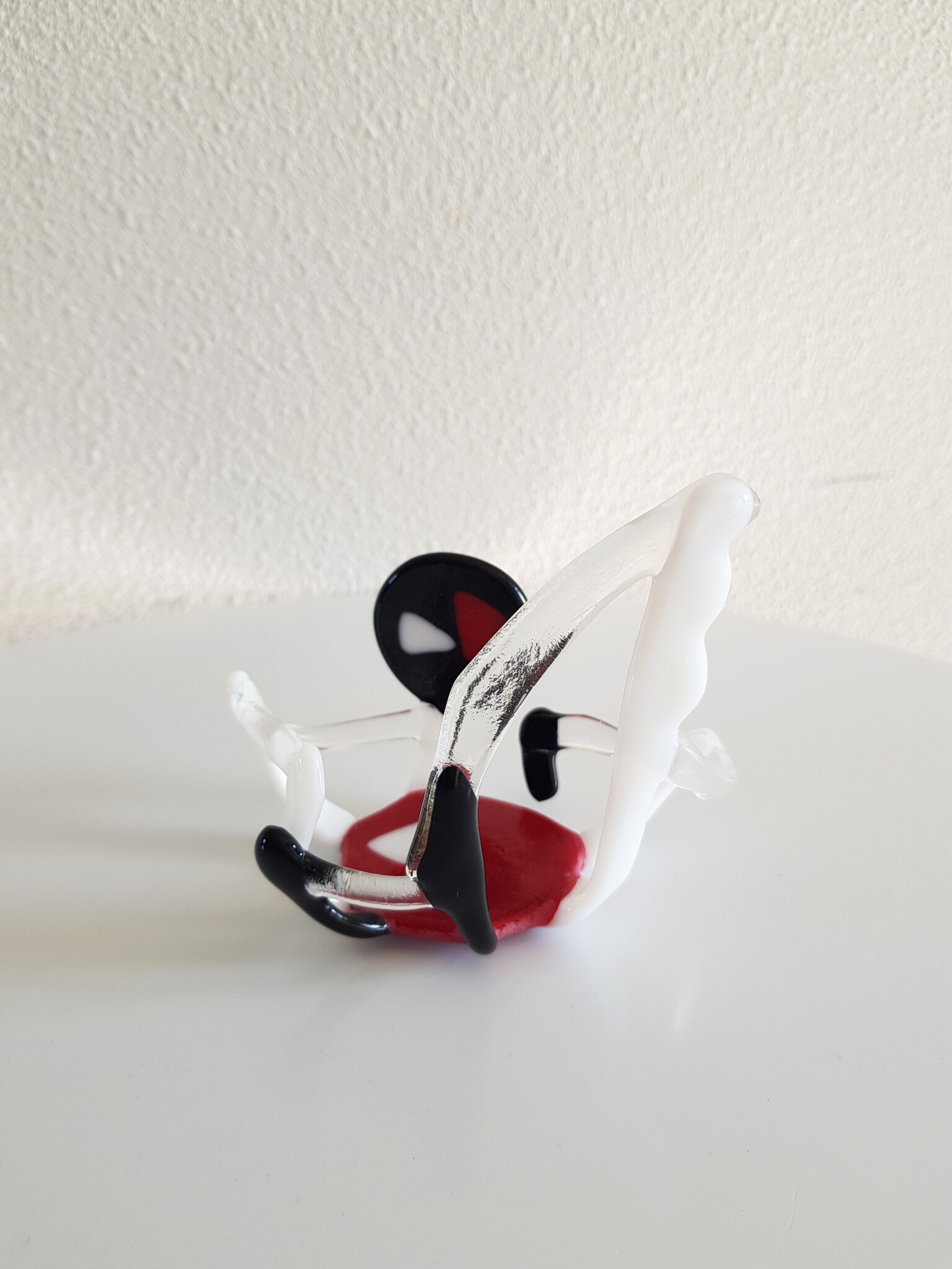 Waxine lichtje of vaasje in zwart wit rood kunst objectje van glas. Op het rondje zijn 2 3-hoekjes gefigureerd. Ik heb deze objectjes ontworpen en gemaakt van fused glas, in eigen atelier in Leiden. Handgemaakt, dus niet perfect. De lagen glas worden gesmolten in mijn glasoven op een temperatuur van ongeveer 800 graden gedurende 18 uur. Bij de 2e stook vorm ik de glazen plaat om in een vorm. Hoe het gemaakt is, kun je ook zien op mijn instagram-posts ( madebymirjam) of via https://madebymirjam.nl Deze objectjes zijn perfect op uw nachtkastje voor oorbellen, ringen, maar ook voor een kaarsje of een vaasje met een klein klaasje er in. De vaasjes of waxinelichtjeshouder meet 8 x 5 cm en is 75 gram zwaar. De diepte is 4 a 5 cm voor een klein glaasje er in. Het komt zorgvuldig verpakt in papier en noppenfolie om ervoor te zorgen dat het veilig aankomt. Het object past niet door de brievenbus, daardoor iets duurder qua verzending, maar dat is bij Exto bij de prijs inbegrepen.